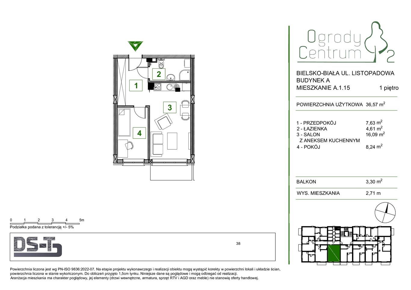 Mieszkanie o powierzchni użytkowej 36,52 m2 położone na pierwszym piętrze składa się z: