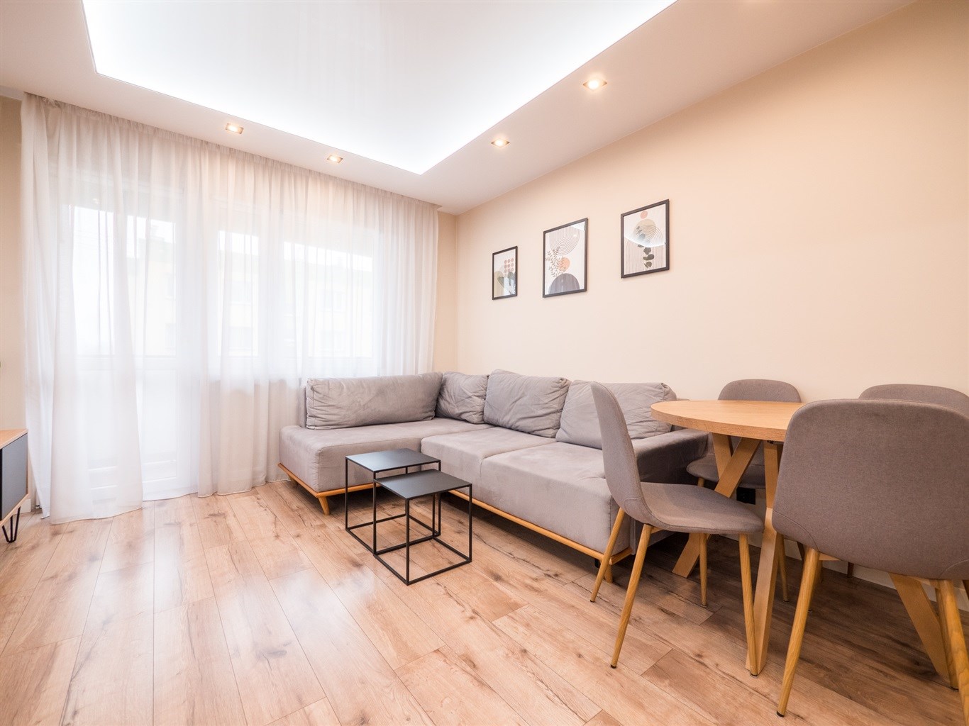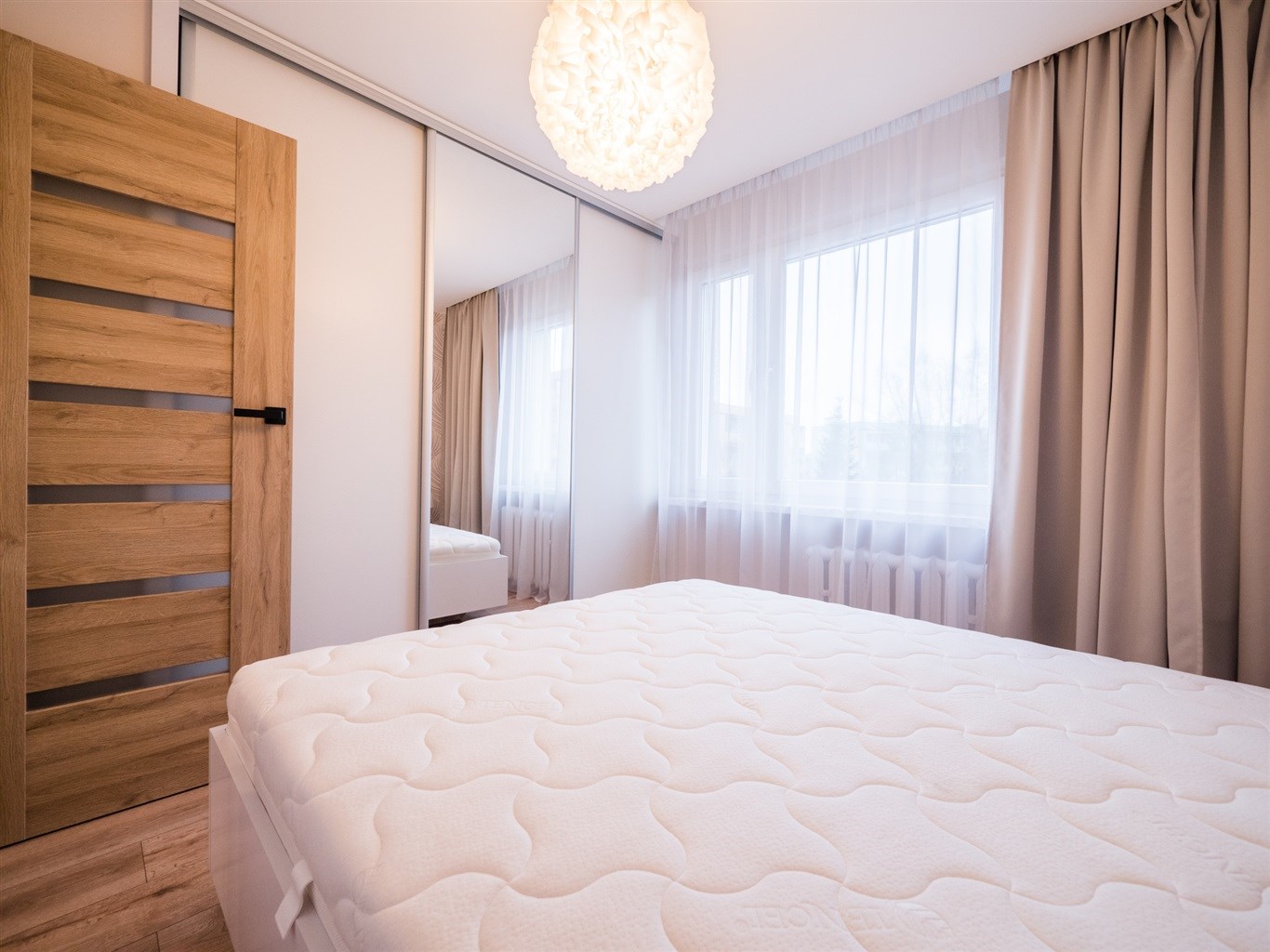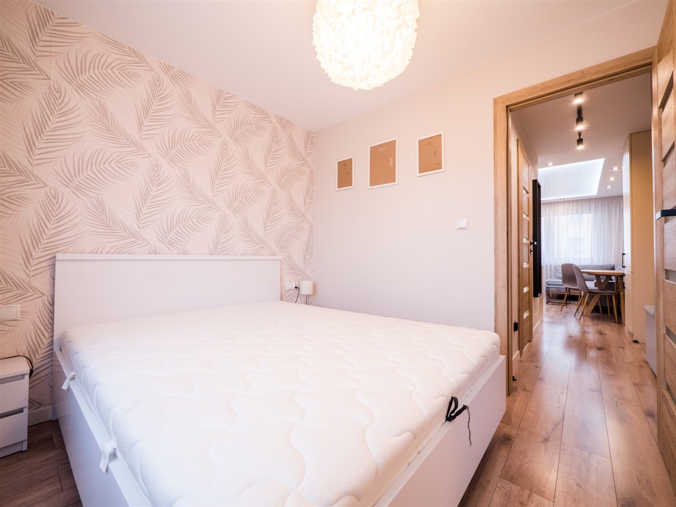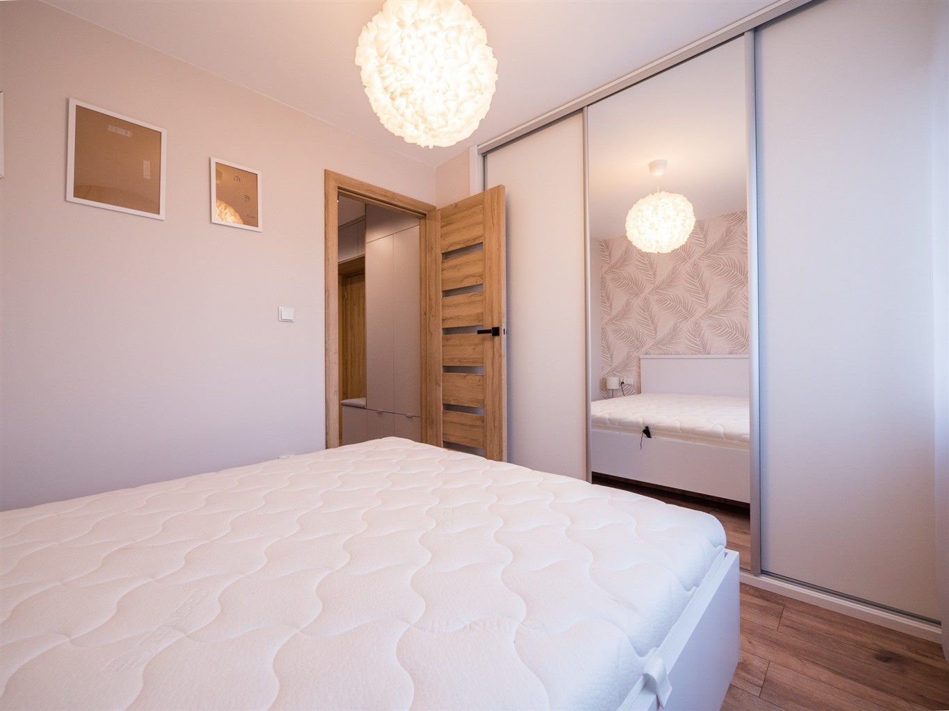 W łazience wysokiej klasy glazura, kabina prysznicowa, pralka oraz suszarka. Na podłogach w pokojach panele o wysokiej klasie ścieralności. Kuchnia na wymiar wyposażona we wszystkie niezbędne sprzęty AGD (lodówko- zamrażarka, płyta indukcyjna, zlew, zmywarka, piekarnik). W salonie rogówka z funkcją spania. W sypialni łóżko małżeńskie oraz pojemna szafa w zabudowie. W przedpokoju szafa w zabudowie + siedzisko. W salonie klimatyzacja. Zastosowane energooszczędne oświetlenie LED w całym mieszkaniu. Do mieszkania przynależy balkon oraz piwnica. Dodatkowo do bloku przynależy parking ogrodzony tylko dla mieszkańców – jedno miejsce parkingowe w cenie najmu