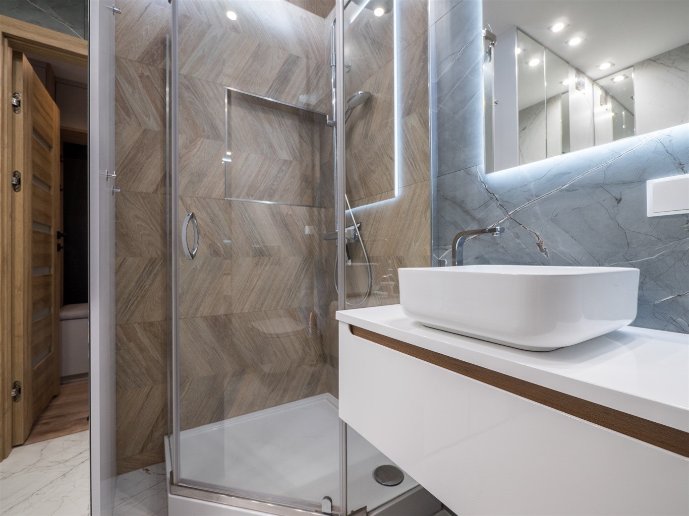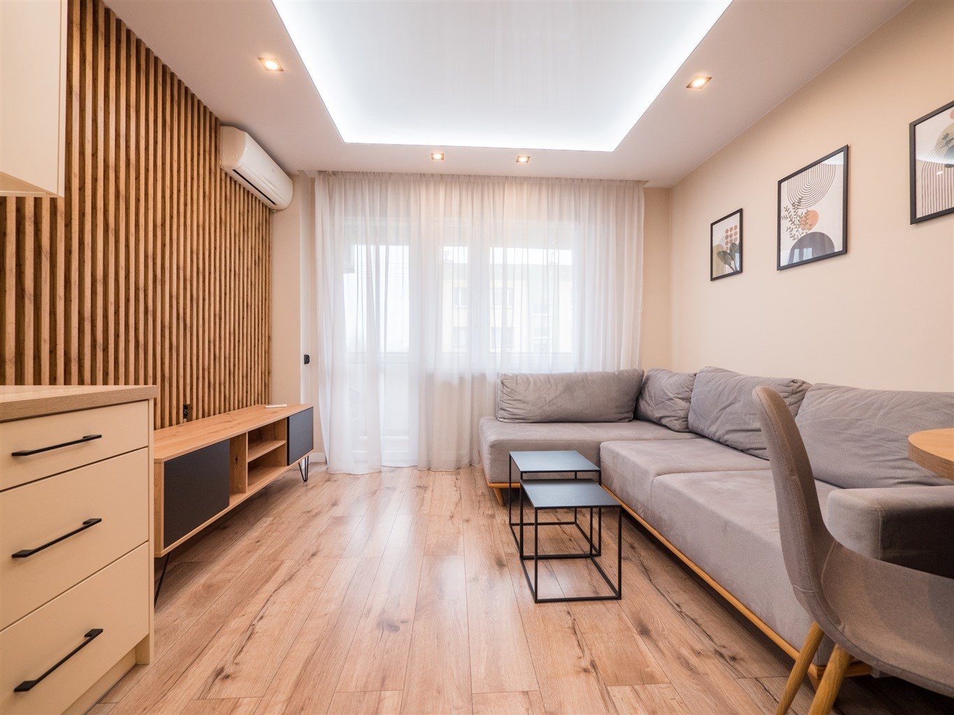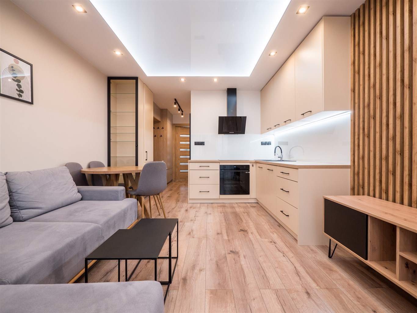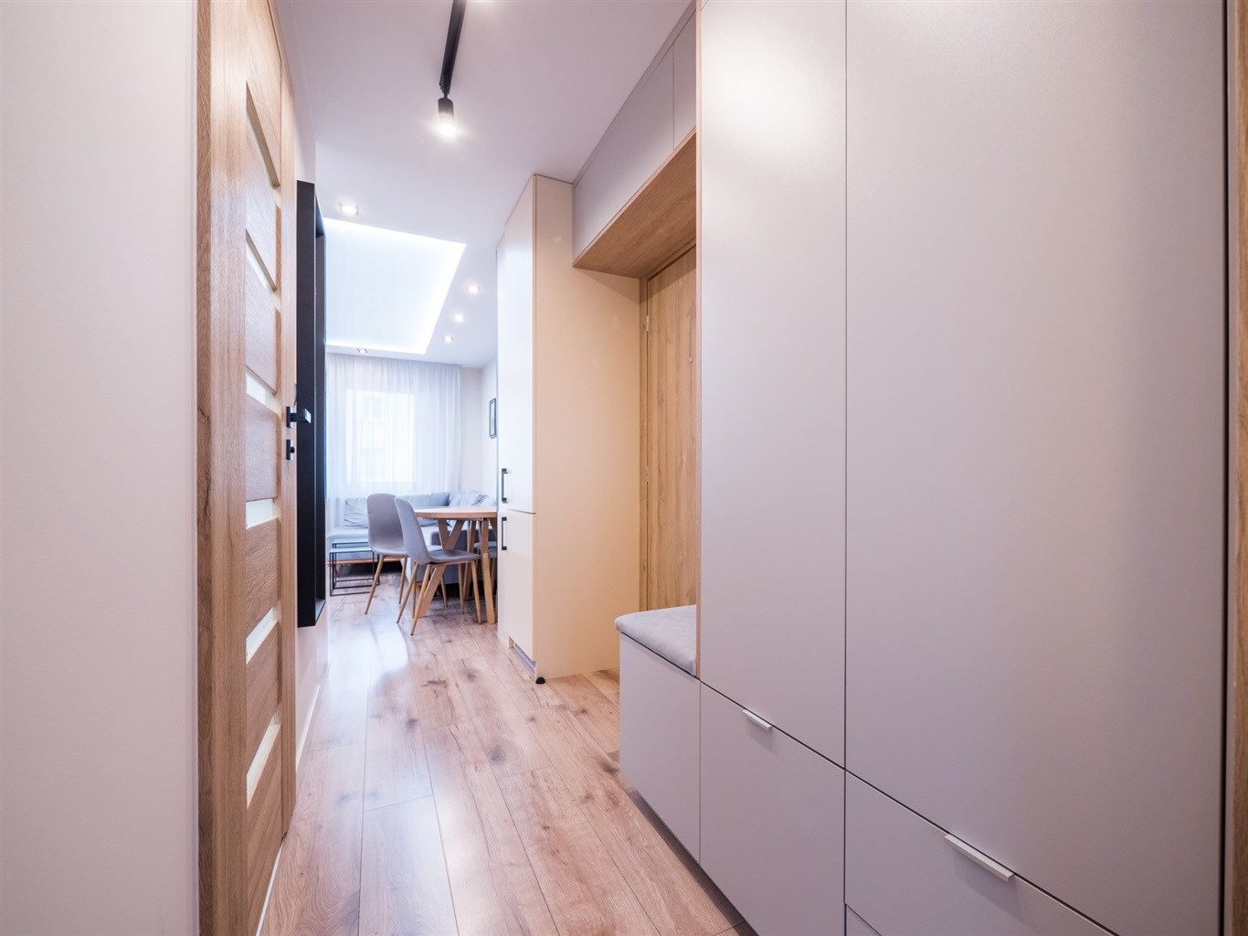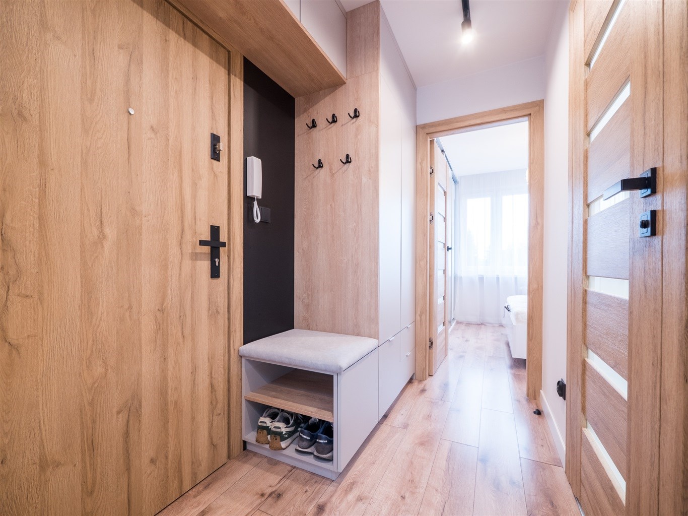 W łazience wysokiej klasy glazura, kabina prysznicowa, pralka oraz suszarka. Na podłogach w pokojach panele o wysokiej klasie ścieralności. Kuchnia na wymiar wyposażona we wszystkie niezbędne sprzęty AGD (lodówko- zamrażarka, płyta indukcyjna, zlew, zmywarka, piekarnik). W salonie rogówka z funkcją spania. W sypialni łóżko małżeńskie oraz pojemna szafa w zabudowie. W przedpokoju szafa w zabudowie + siedzisko. W salonie klimatyzacja. Zastosowane energooszczędne oświetlenie LED w całym mieszkaniu. Do mieszkania przynależy balkon oraz piwnica. Dodatkowo do bloku przynależy parking ogrodzony tylko dla mieszkańców – jedno miejsce parkingowe w cenie najmu