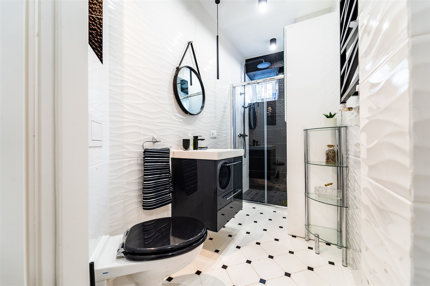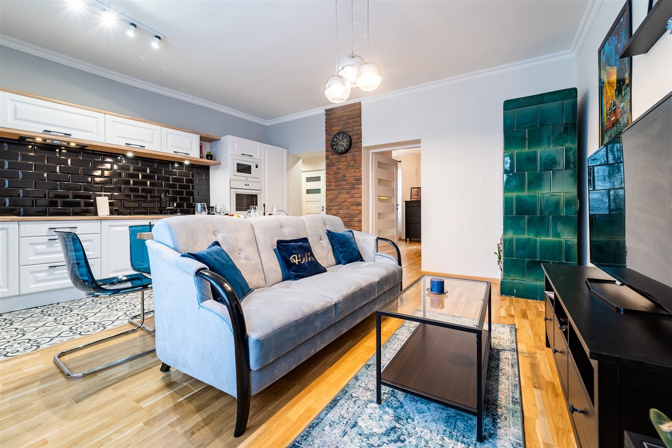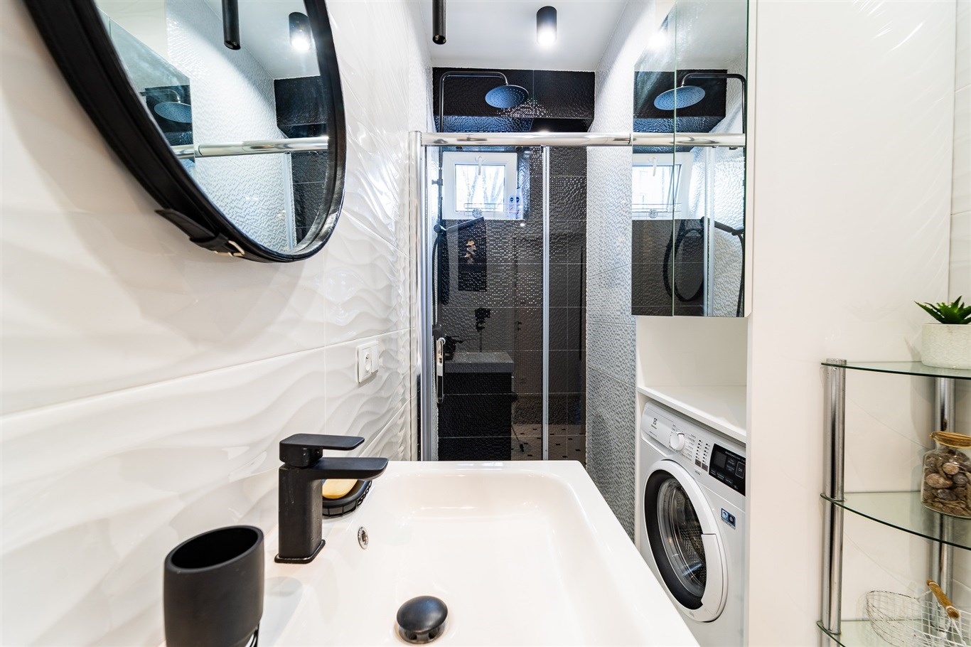 Kuchnia w zabudowie wraz ze sprzętami AGD; lodówka, mikrofalówka, płyta indukcyjna, zlew, piekarnik, pralka. Łazienka wykończona w wysokiej klasy glazurze, wyposażona w kabinę prysznicową. W całym mieszkaniu wykorzystane energooszczędne oświetlenie LED-owe.
