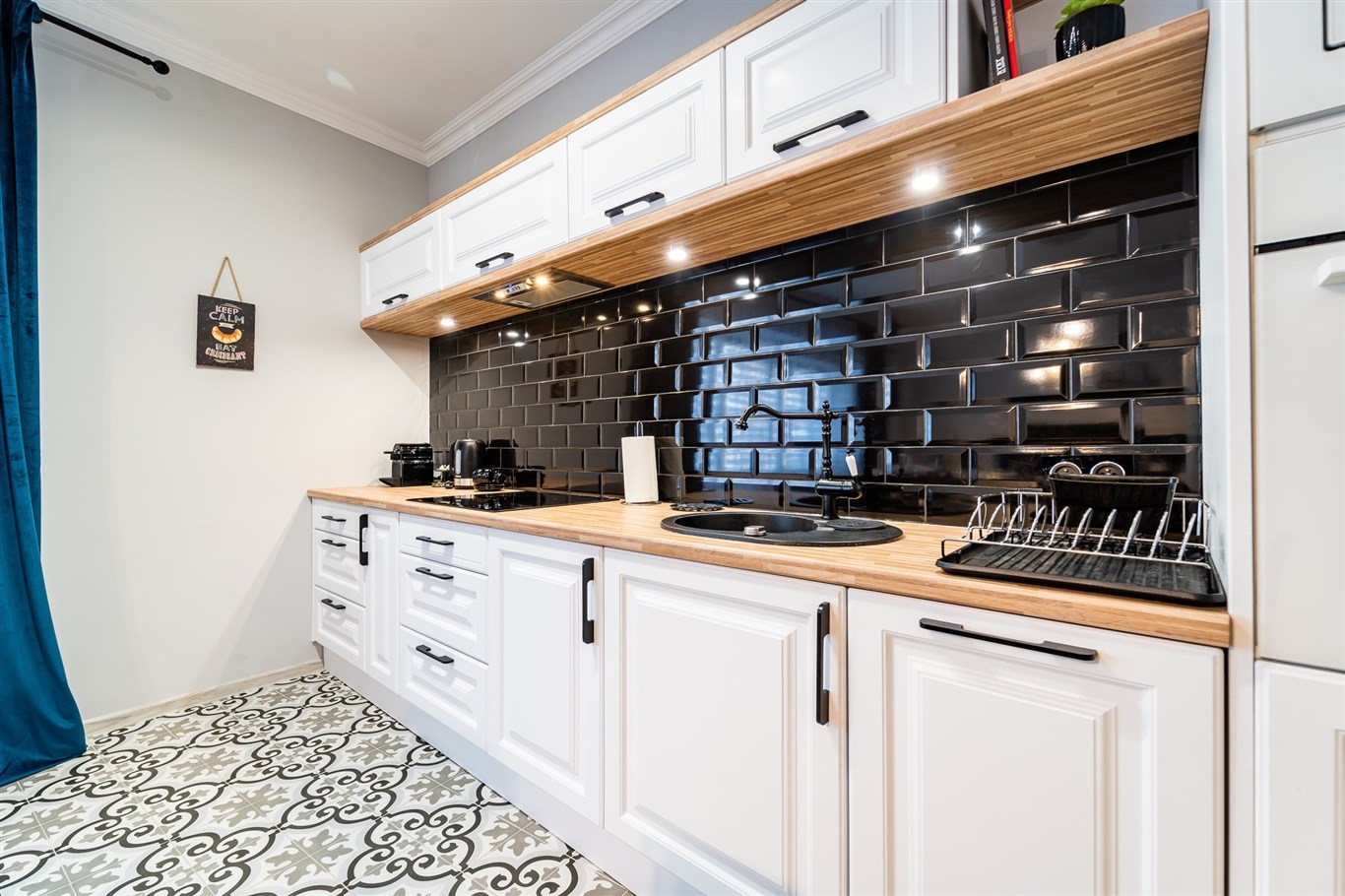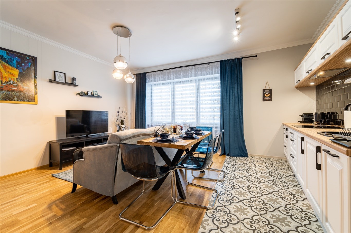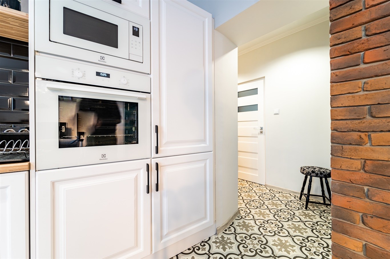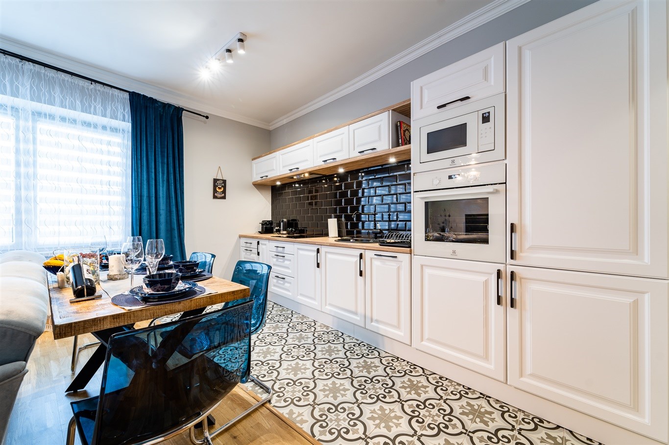 Kuchnia w zabudowie wraz ze sprzętami AGD; lodówka, mikrofalówka, płyta indukcyjna, zlew, piekarnik, pralka. Łazienka wykończona w wysokiej klasy glazurze, wyposażona w kabinę prysznicową. W całym mieszkaniu wykorzystane energooszczędne oświetlenie LED-owe.