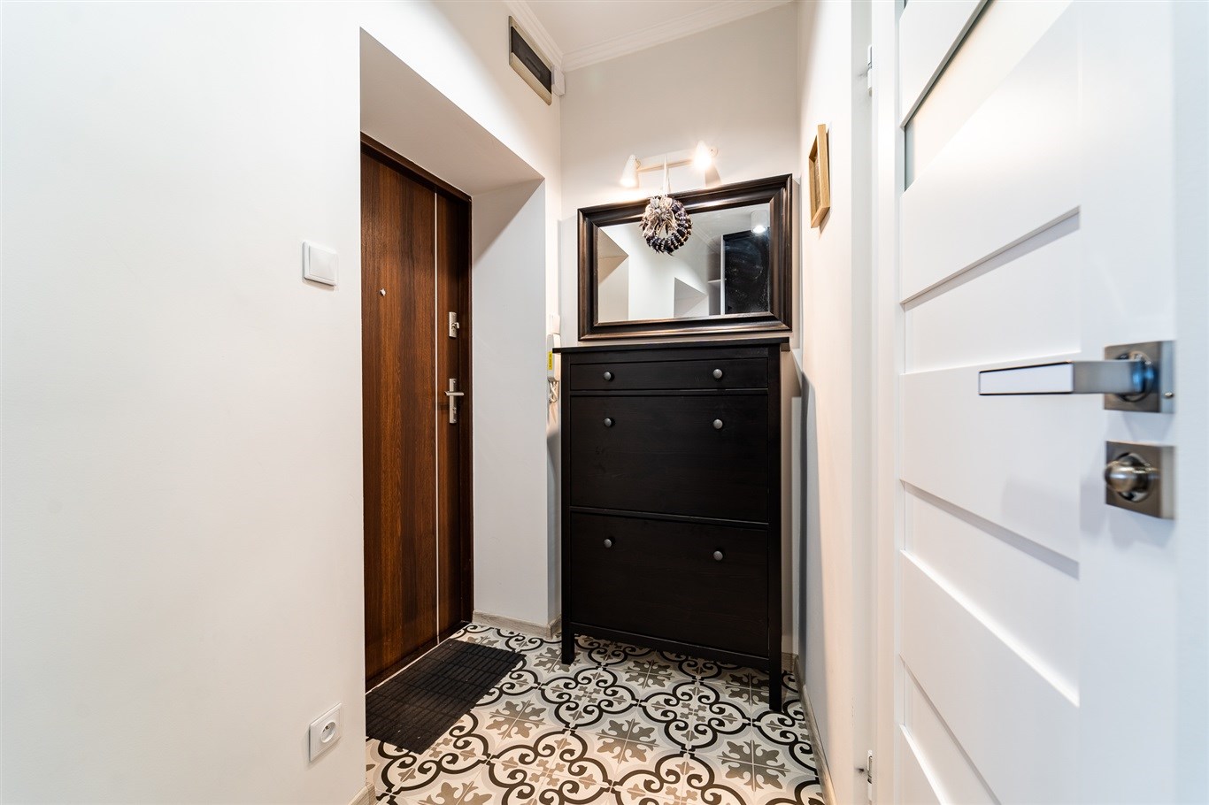 W przedpokoju pojemna szafa w zabudowie. Mieszkanie jest wynajmowane ze wszystkimi widocznymi na zdjęciach sprzętami oraz meblami.