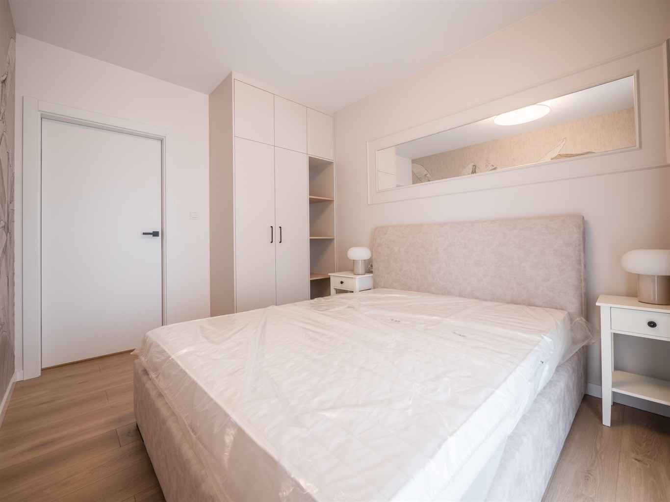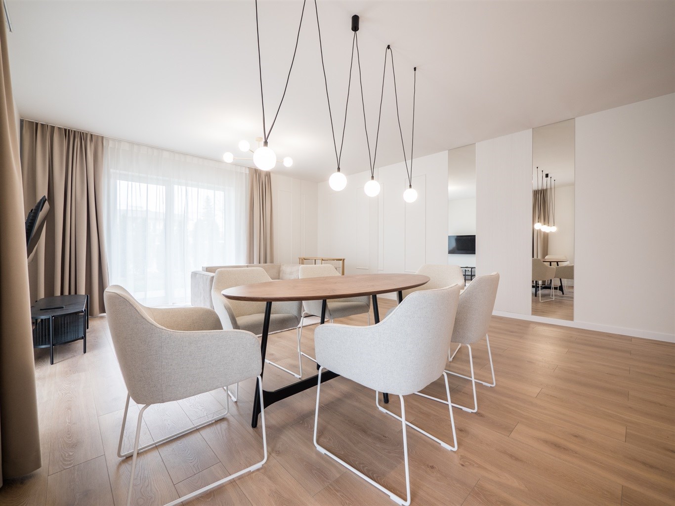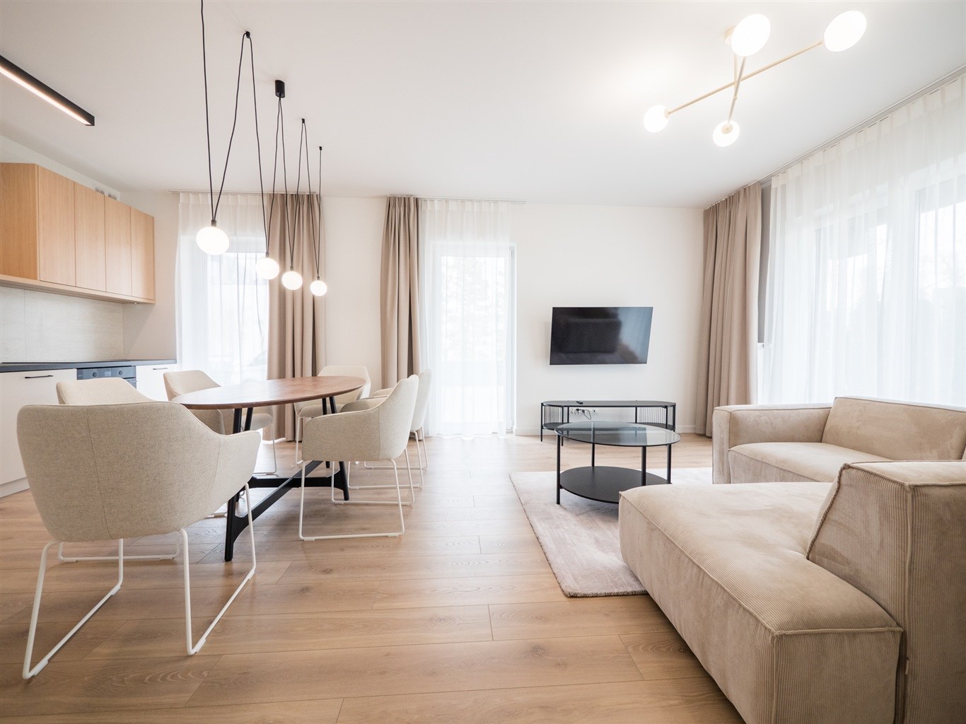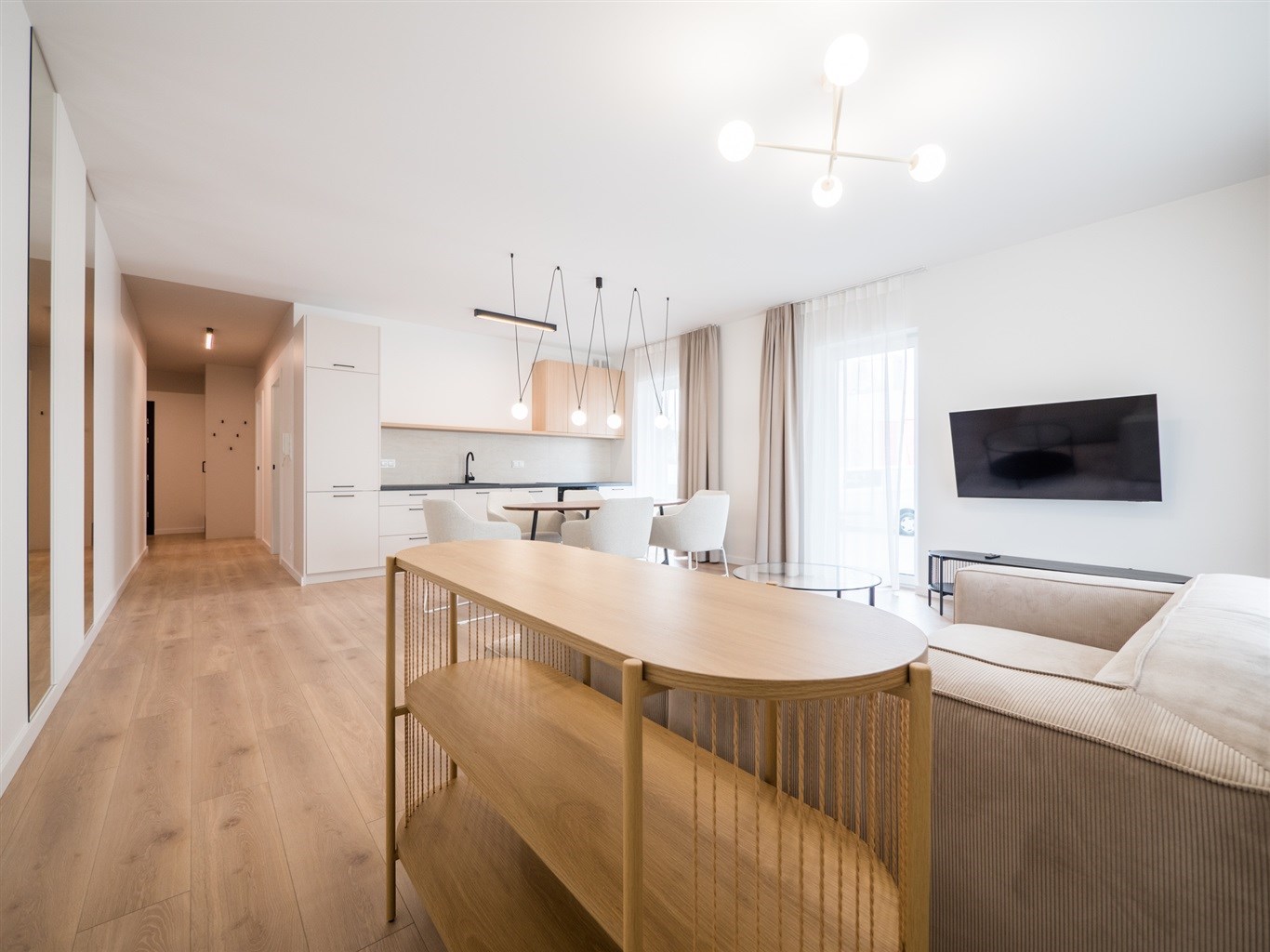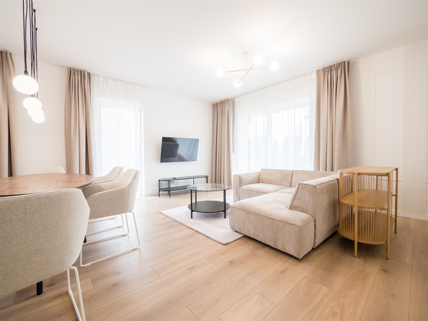 W salonie stół z krzesłami, sofa, stolik okolicznościowy , telewizor. Aneks kuchenny w nowoczesnej zabudowie wyposażony w niezbędne sprzęty AGD. W obu sypialniach łóżką z materacami oraz pojemne szafy w zabudowie.W przedpokoju szafa oraz siedzisko.