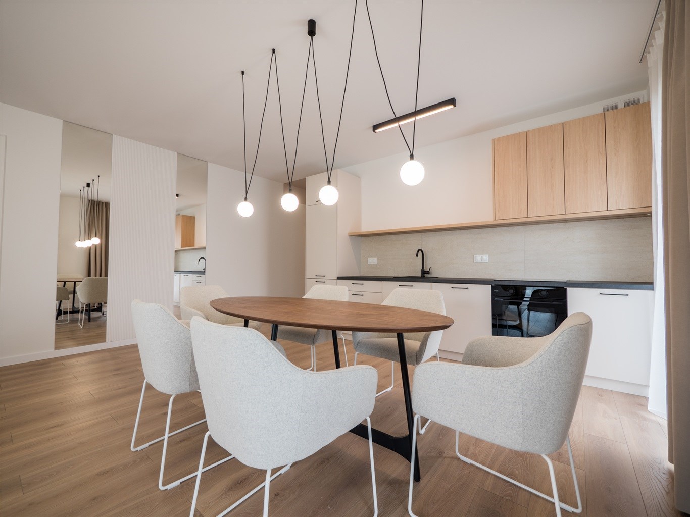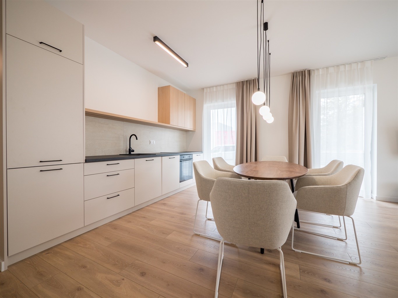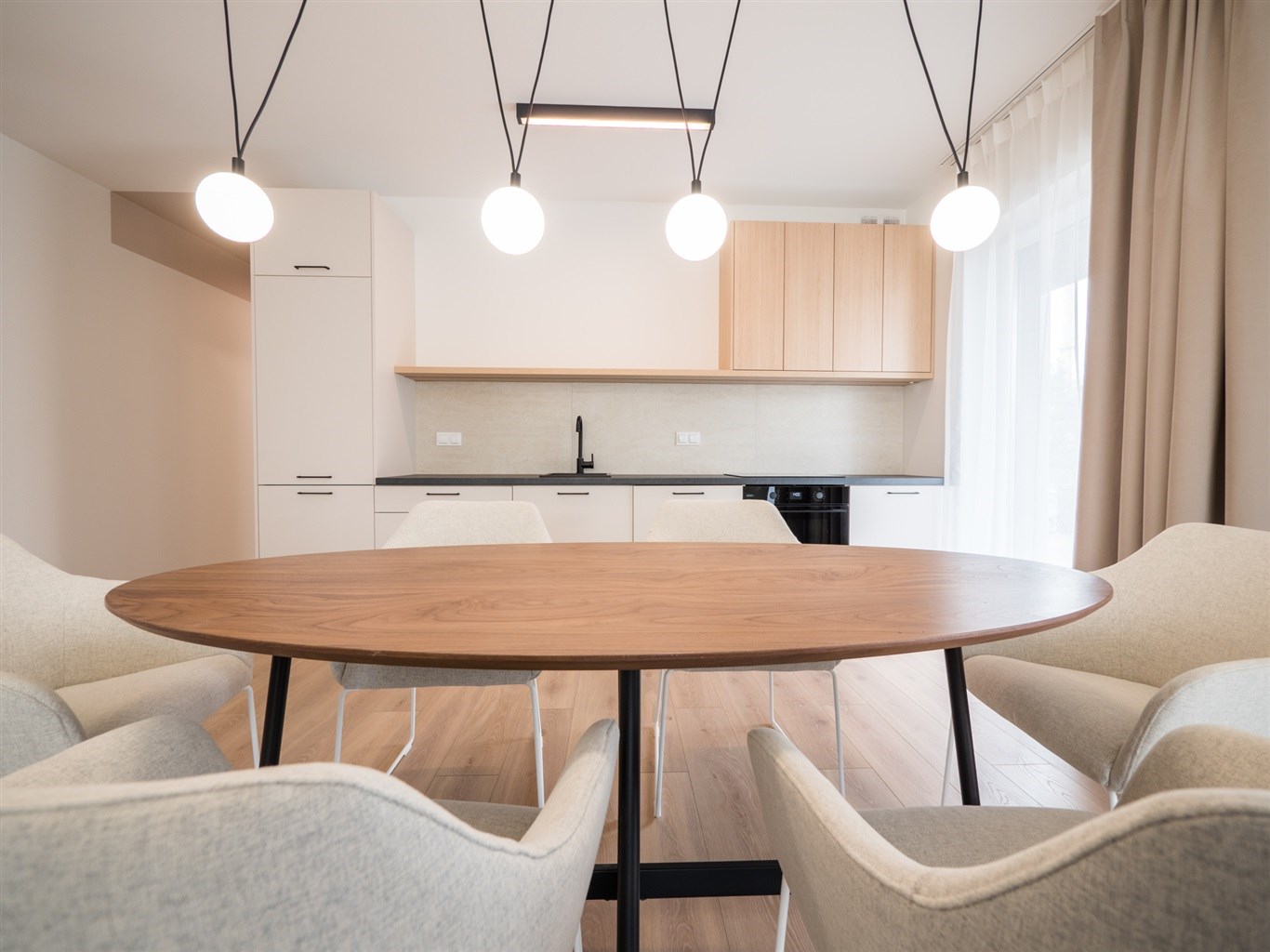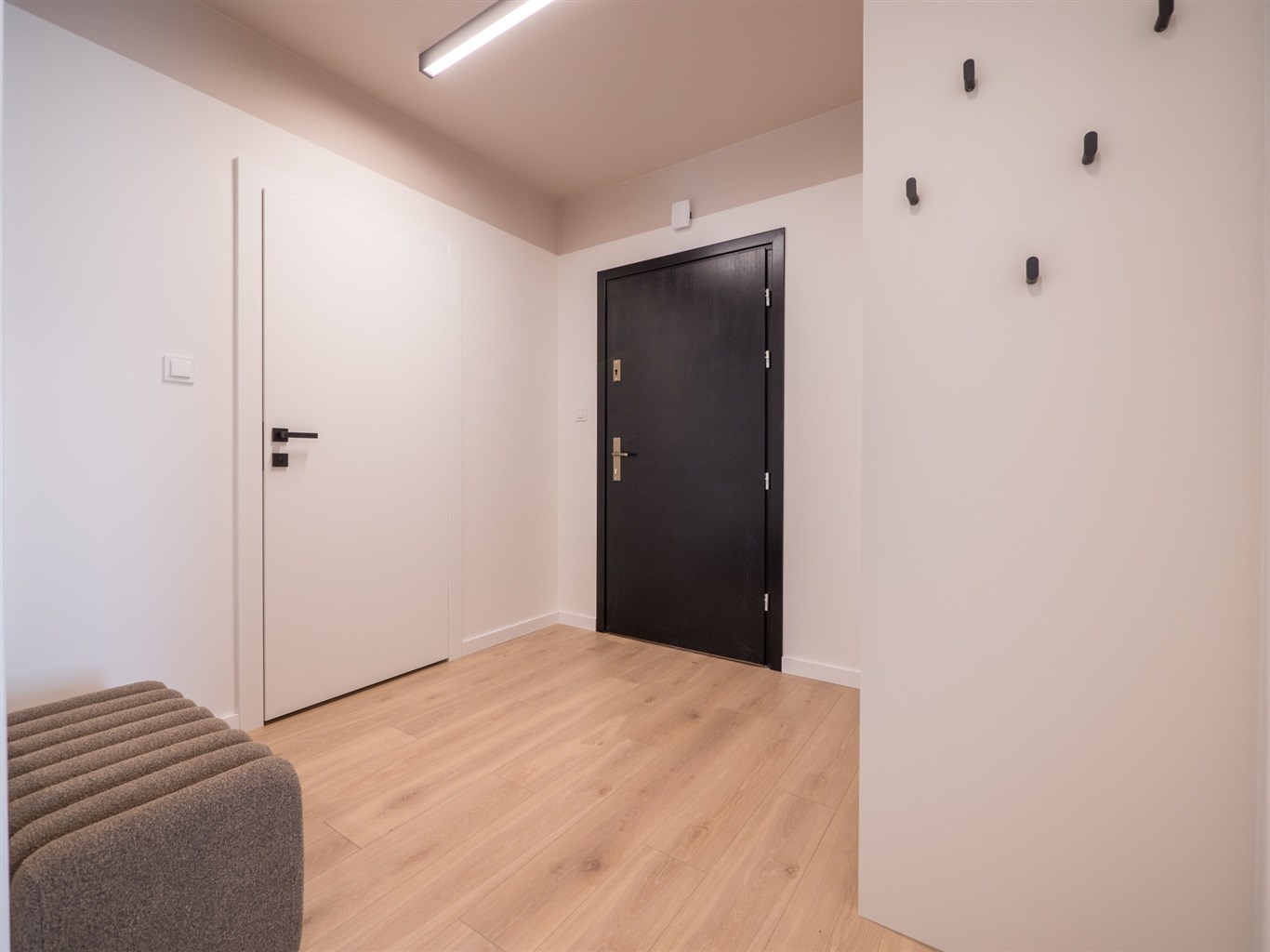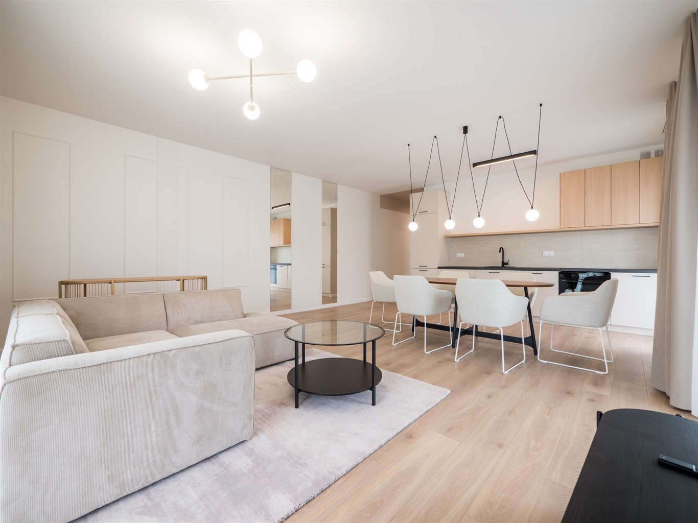 W salonie stół z krzesłami, sofa, stolik okolicznościowy , telewizor. Aneks kuchenny w nowoczesnej zabudowie wyposażony w niezbędne sprzęty AGD. W obu sypialniach łóżką z materacami oraz pojemne szafy w zabudowie.W przedpokoju szafa oraz siedzisko.
