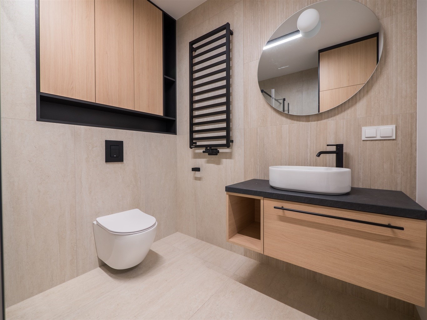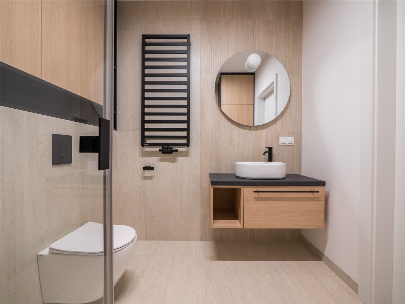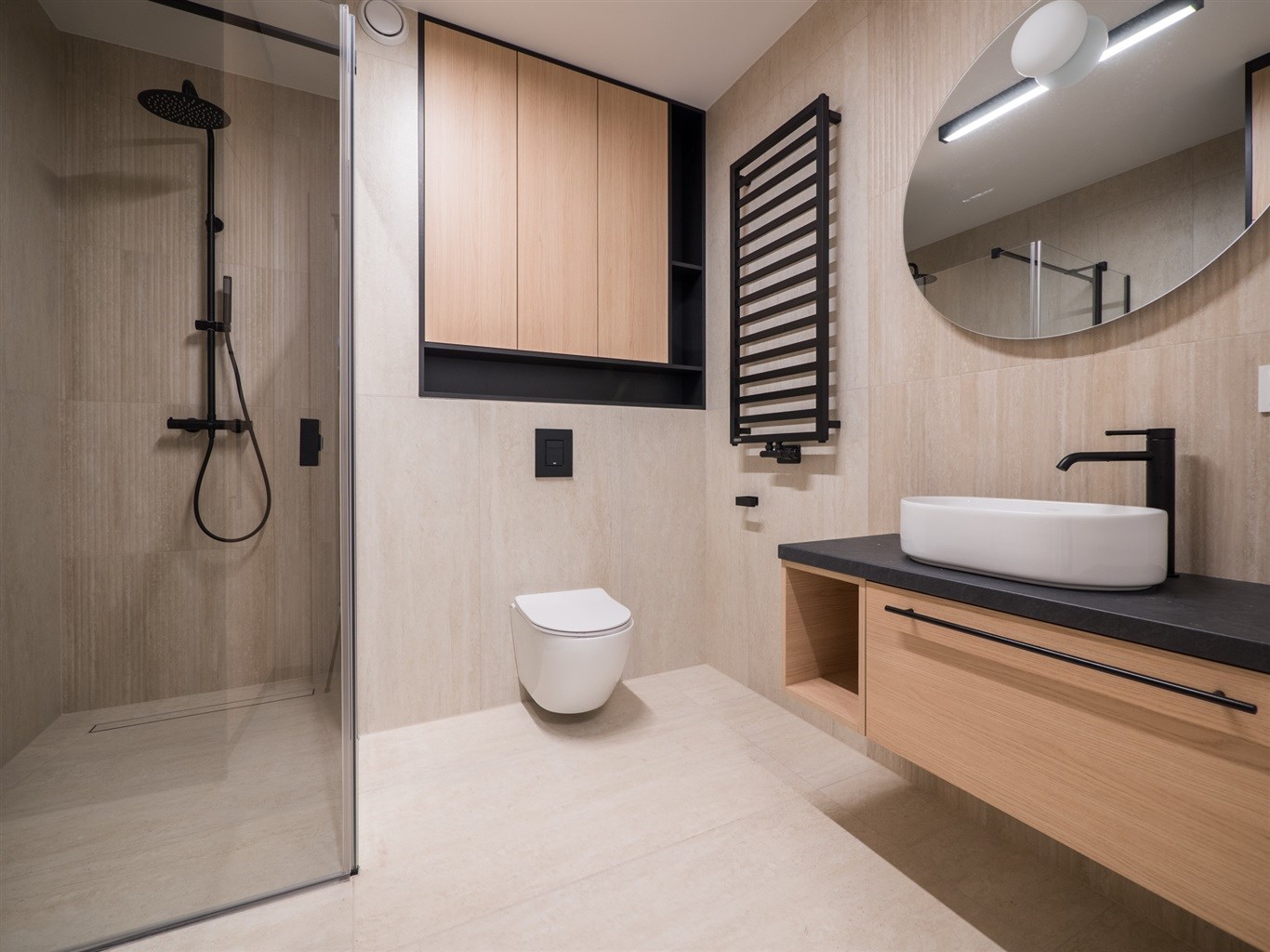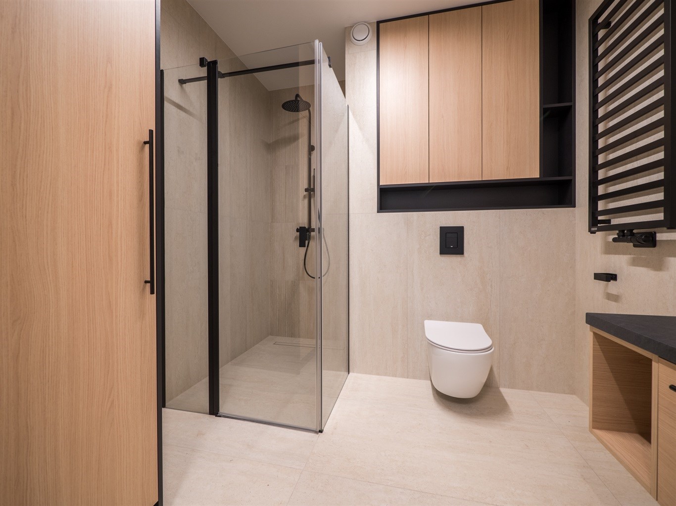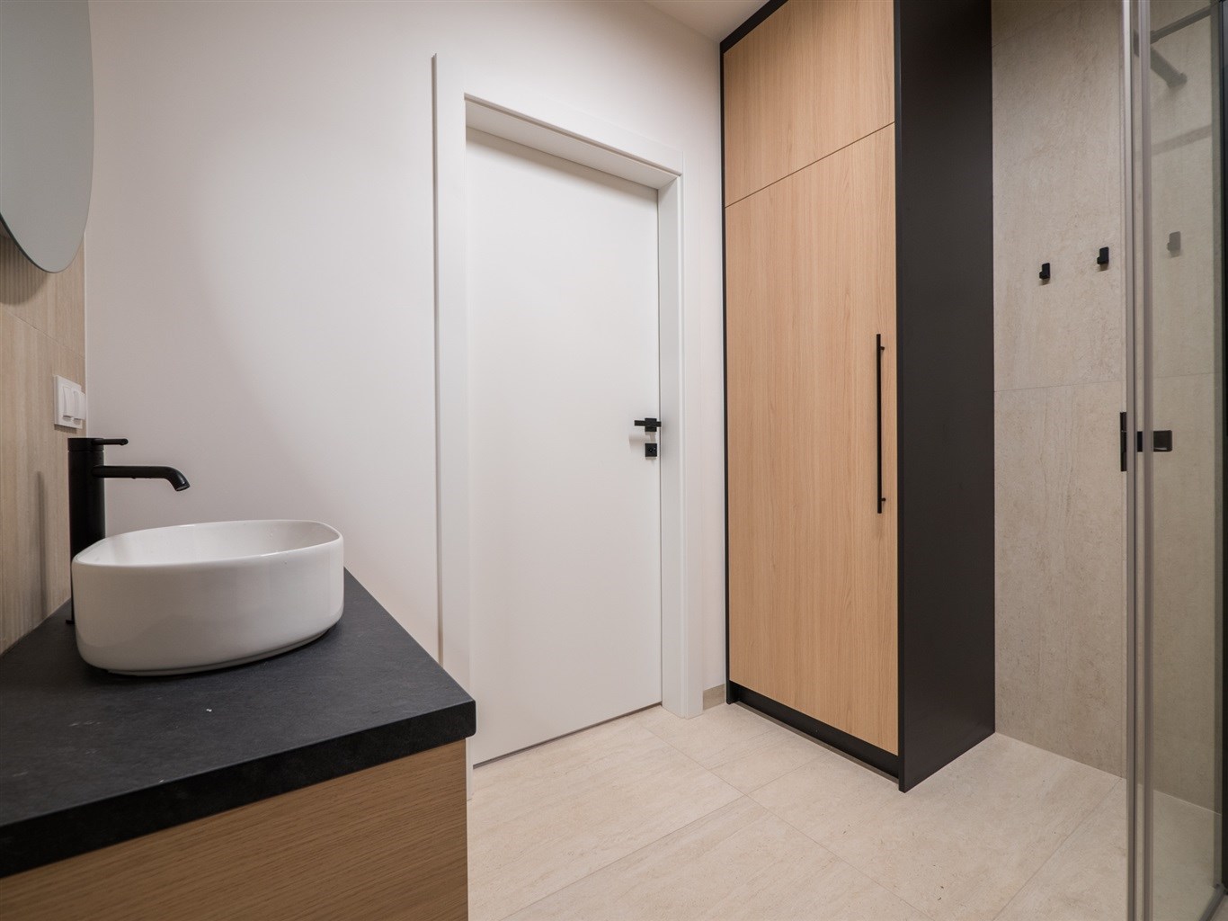 Łazienka wykończona w glazurze, obszerna kabina prysznicowa oraz pralka. Mieszkanie ustawne, przestronne, wykończone z najwyższej klasy materiałów.
