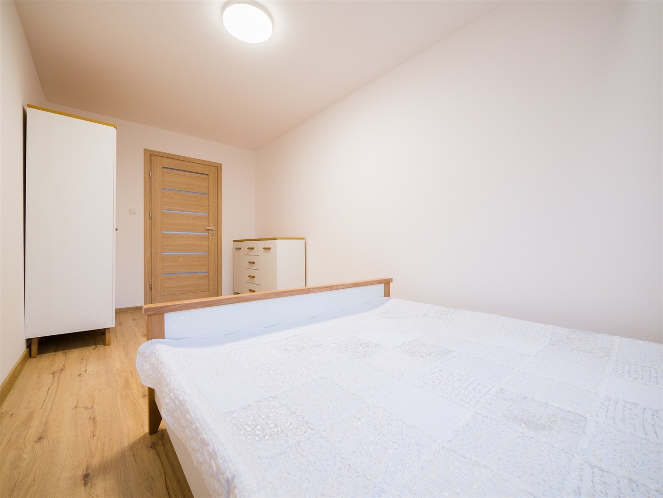 W salonie rogówka sofa, stolik kawowy, stolik RTV. Ponadto stół z czterema krzesłami. W sypialni podwójne łóżko z materacem + szafa i komoda.