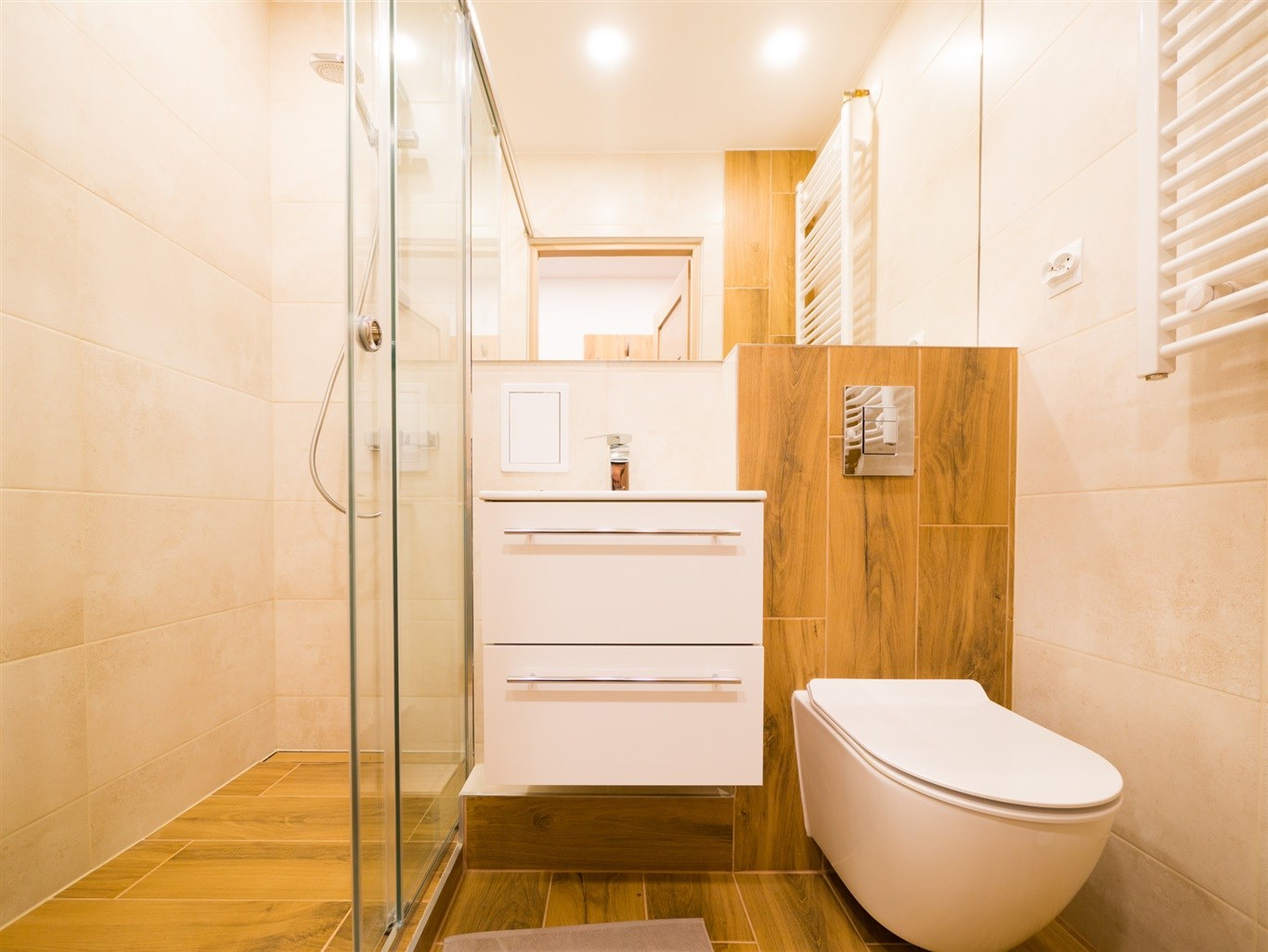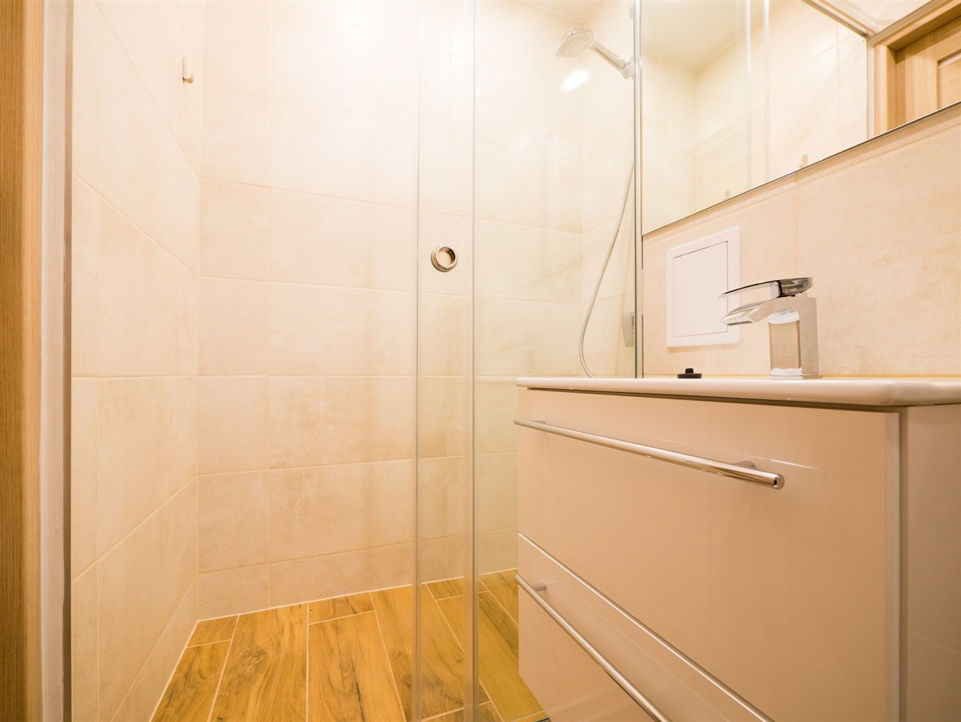 Kuchnia w zabudowie wraz ze wszystkimi niezbędnymi sprzętami AGD wysokiej jakości; lodówka, zmywarka, płyta indukcyjna, zlew, piekarnik, pralka. Łazienka wykończona w wysokiej klasy glazurze wyposażona w kabinę prysznicową. W całym mieszkaniu wykorzystane energooszczędne oświetlenie LED-owe.