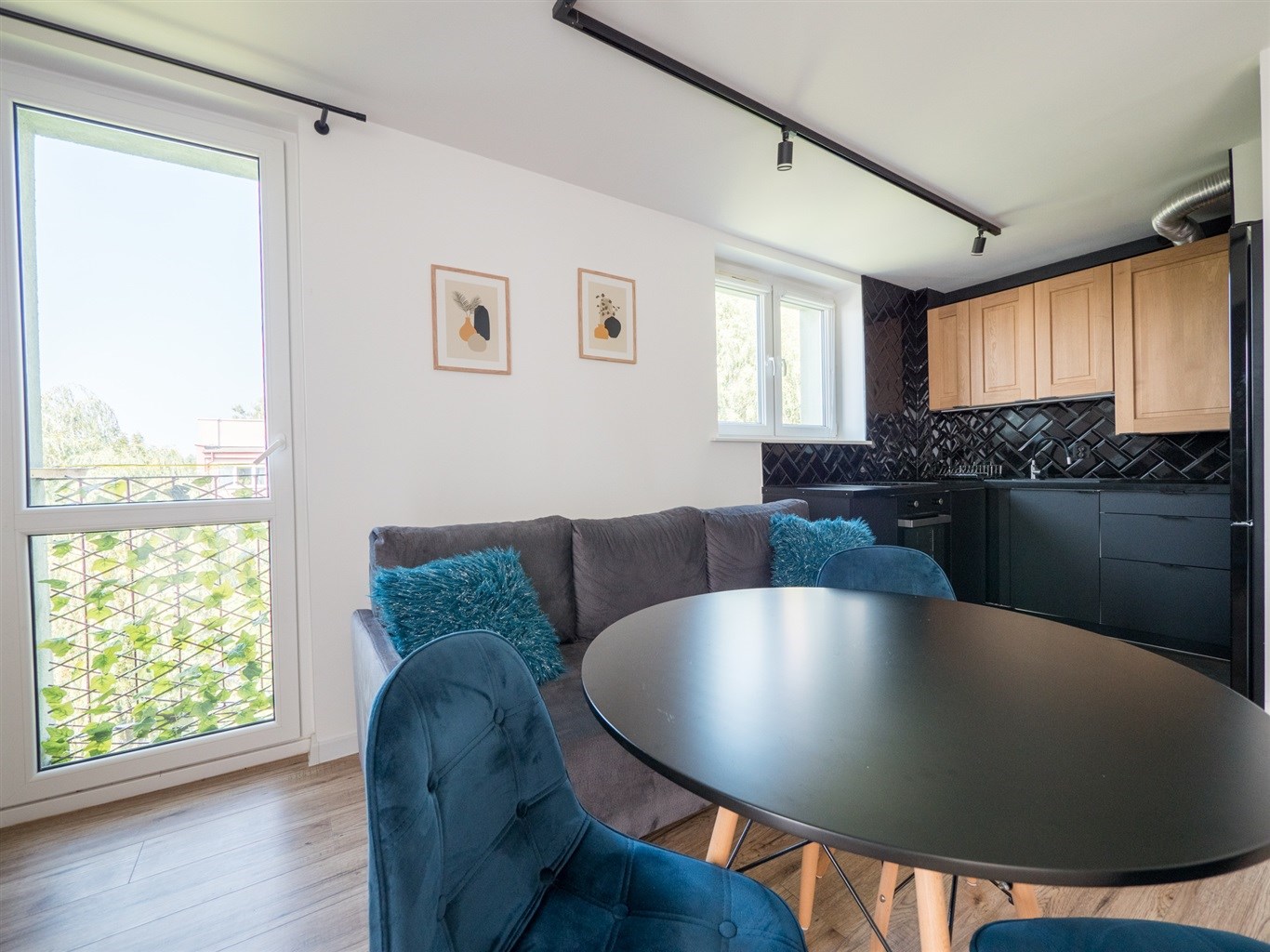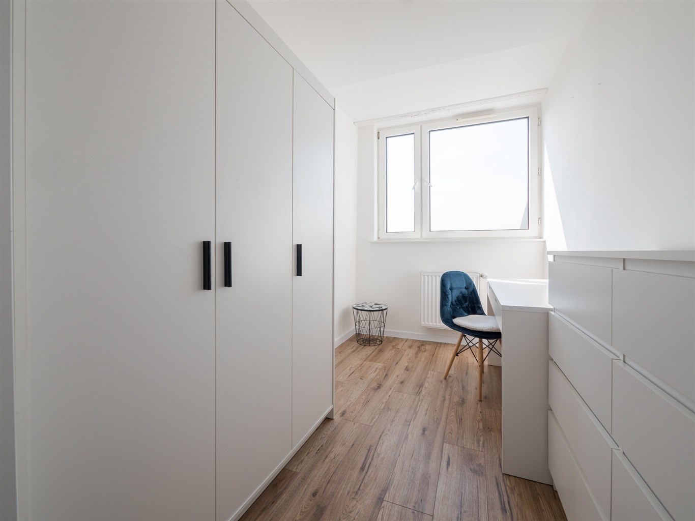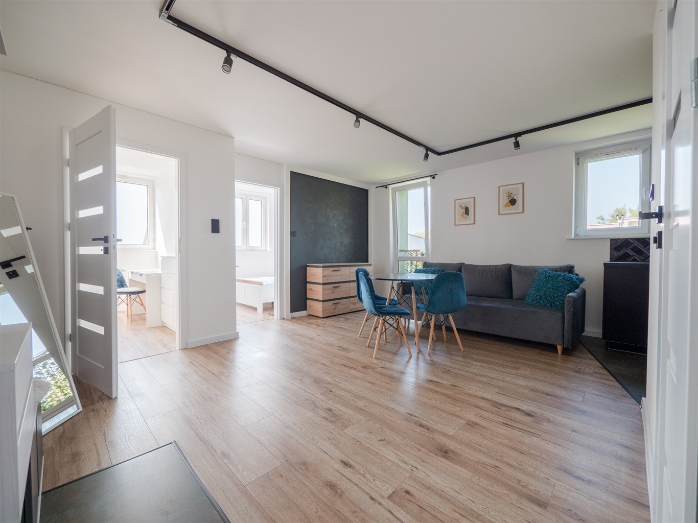 Salon wyposażony w nowoczesną sofę, stół + dwa krzesła, półkę RTV. Sypialnia wyposażona w łóżko z materacem oraz pojemną szafę. Trzeci pokój idealny jako biuro/gabinet. Aneks kuchenny w zabudowie wyposażony w niezbędne sprzęty AGD (lodówko-zamrażarka, piekarnik, zlew, płyta indukcyjna).