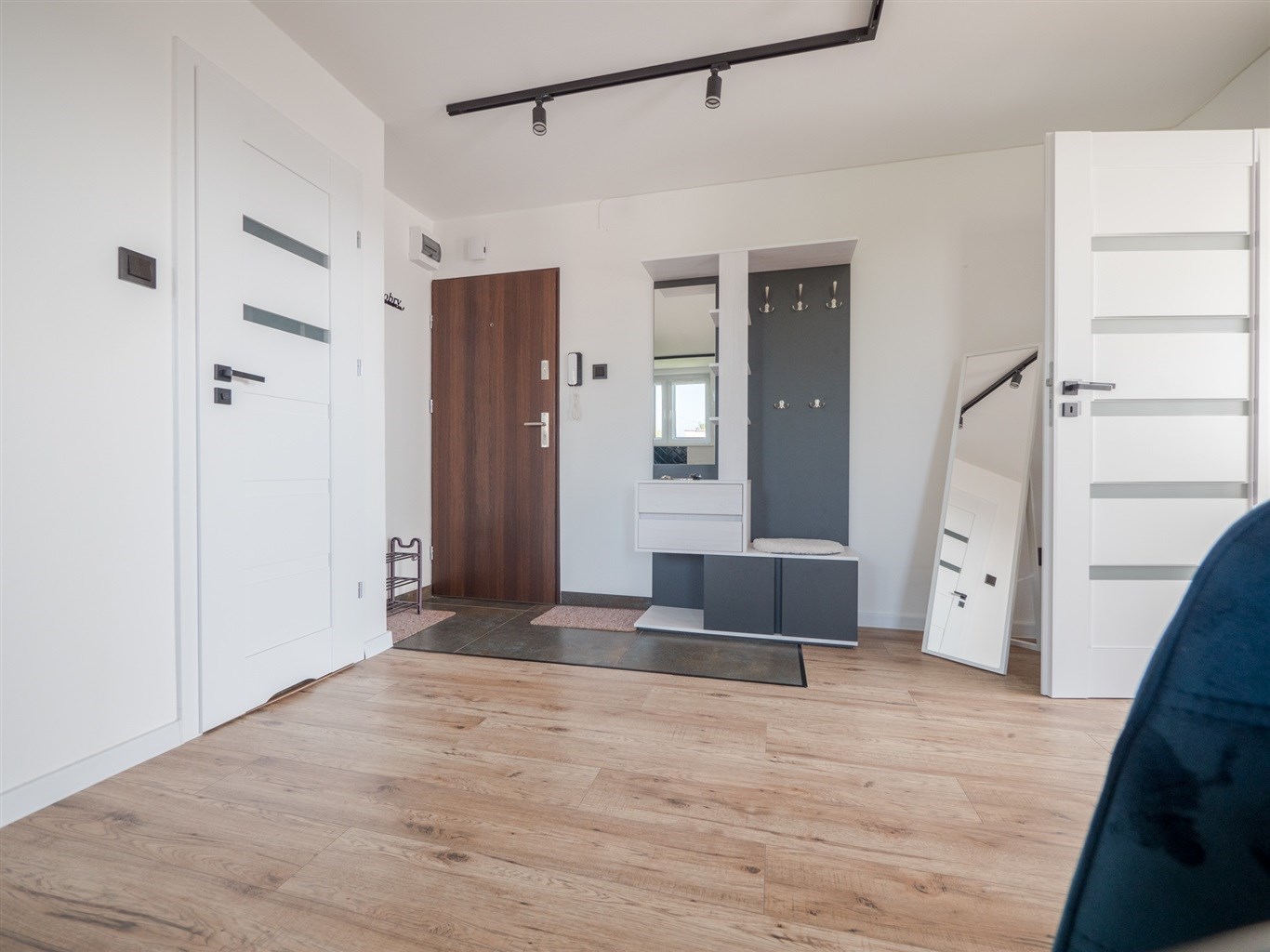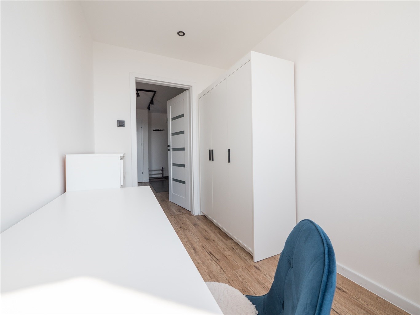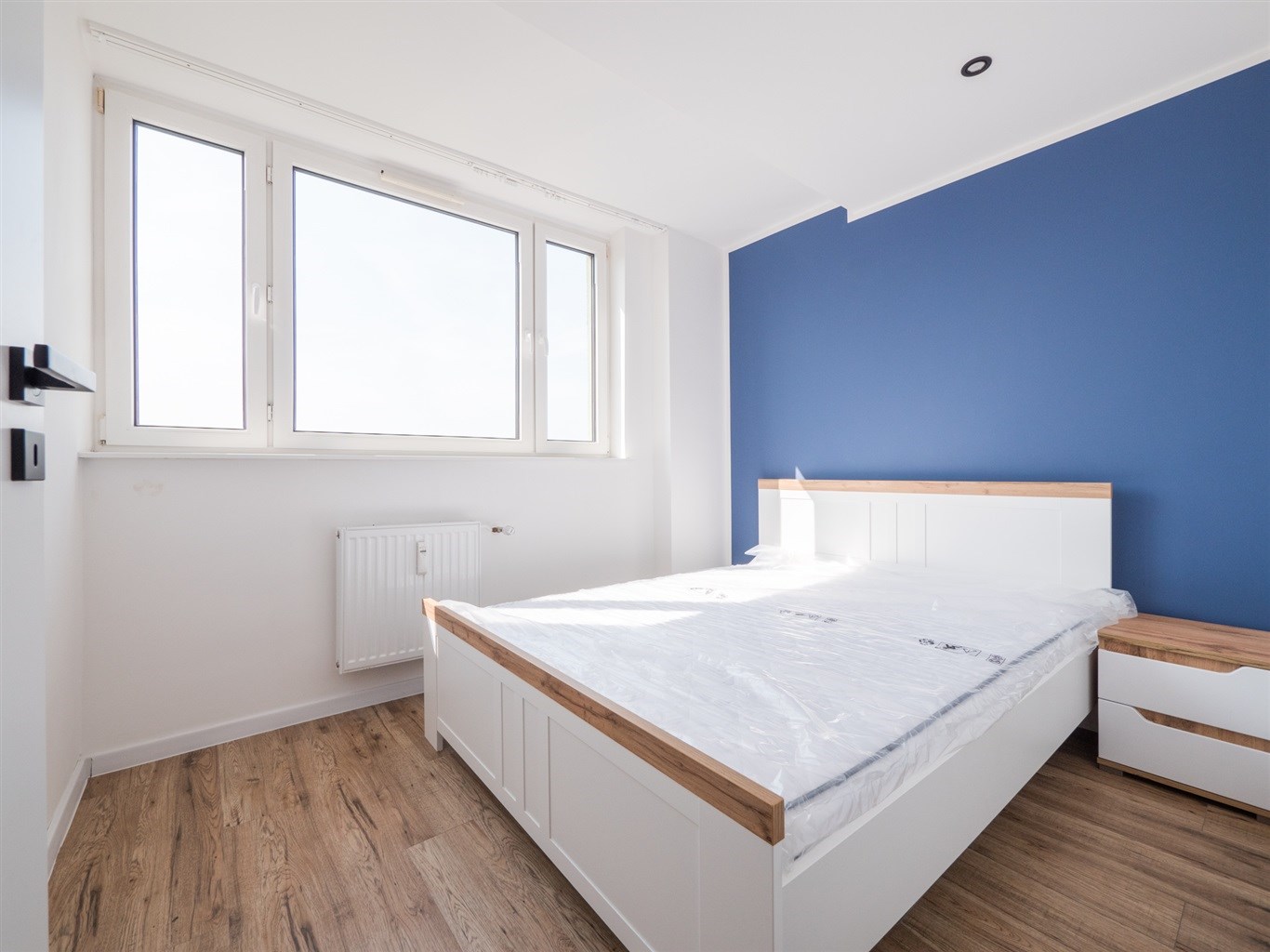 Salon wyposażony w nowoczesną sofę, stół + dwa krzesła, półkę RTV. Sypialnia wyposażona w łóżko z materacem oraz pojemną szafę. Trzeci pokój idealny jako biuro/gabinet. Aneks kuchenny w zabudowie wyposażony w niezbędne sprzęty AGD (lodówko-zamrażarka, piekarnik, zlew, płyta indukcyjna).