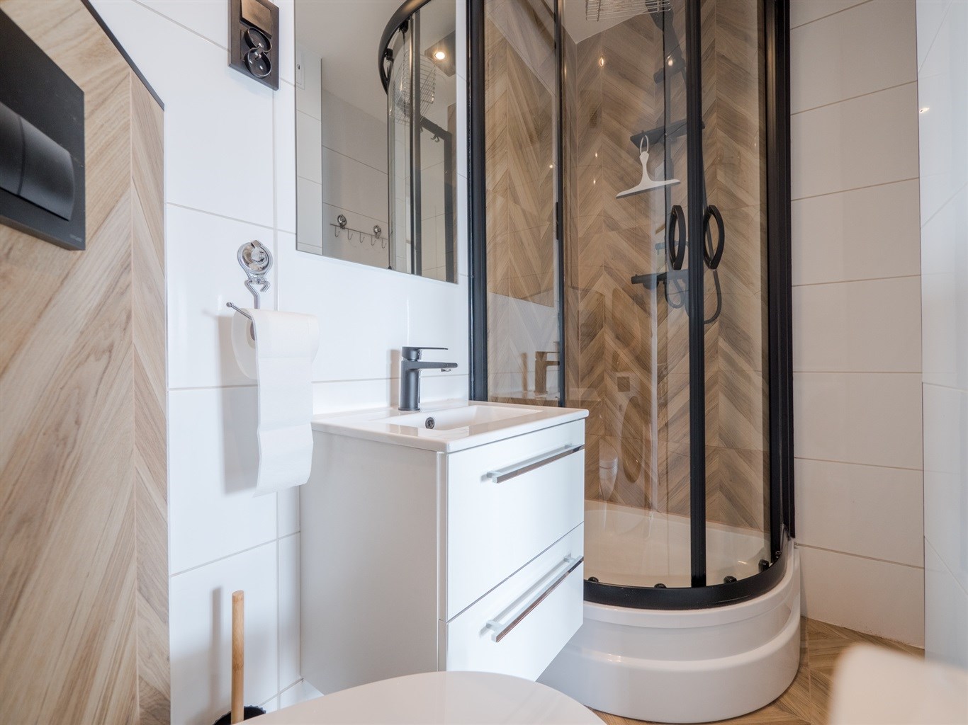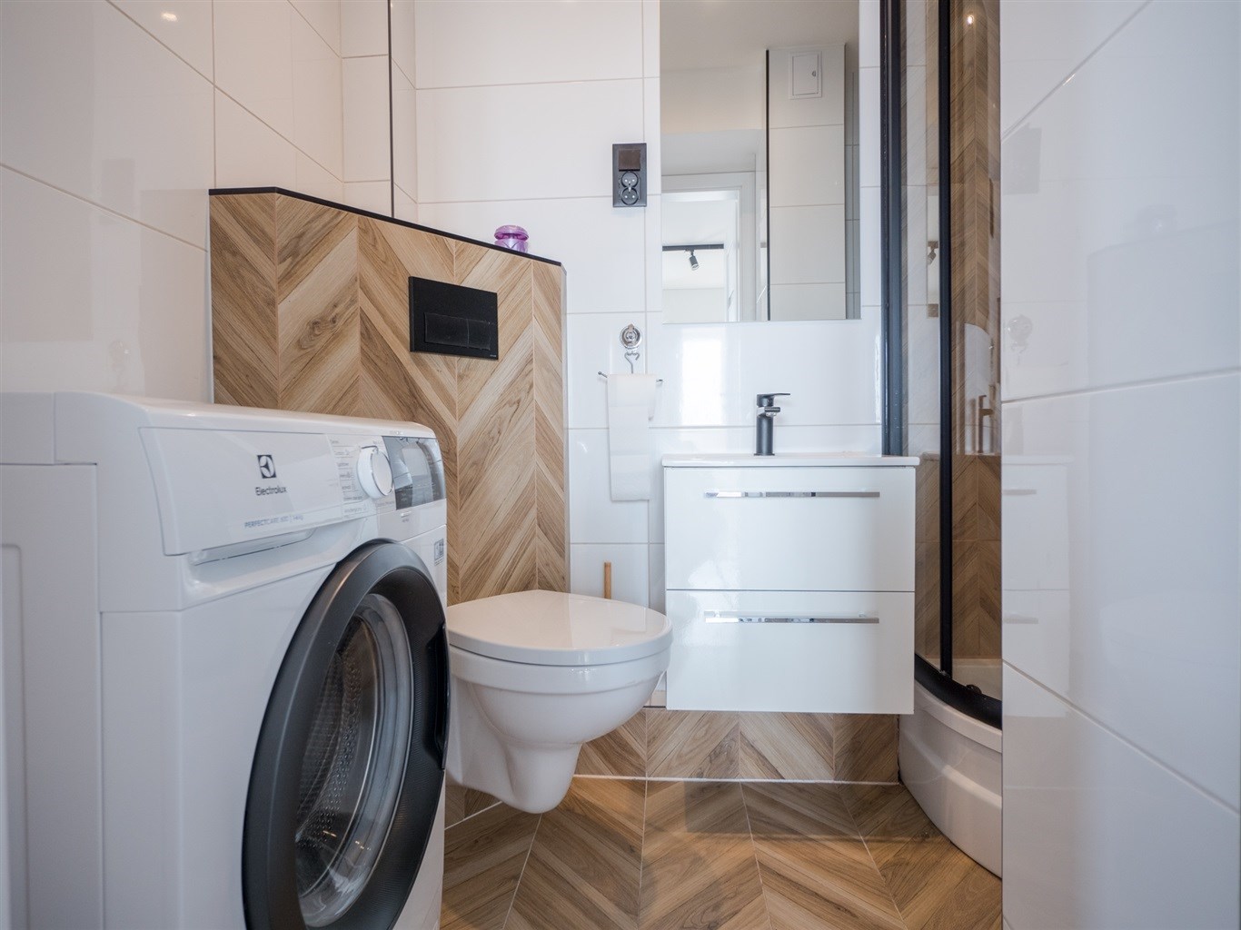 W łazience wysokiej klasy glazura, kabina prysznicowa, pralka. W pokojach na podłogach panele o wysokiej klasie ścieralności.