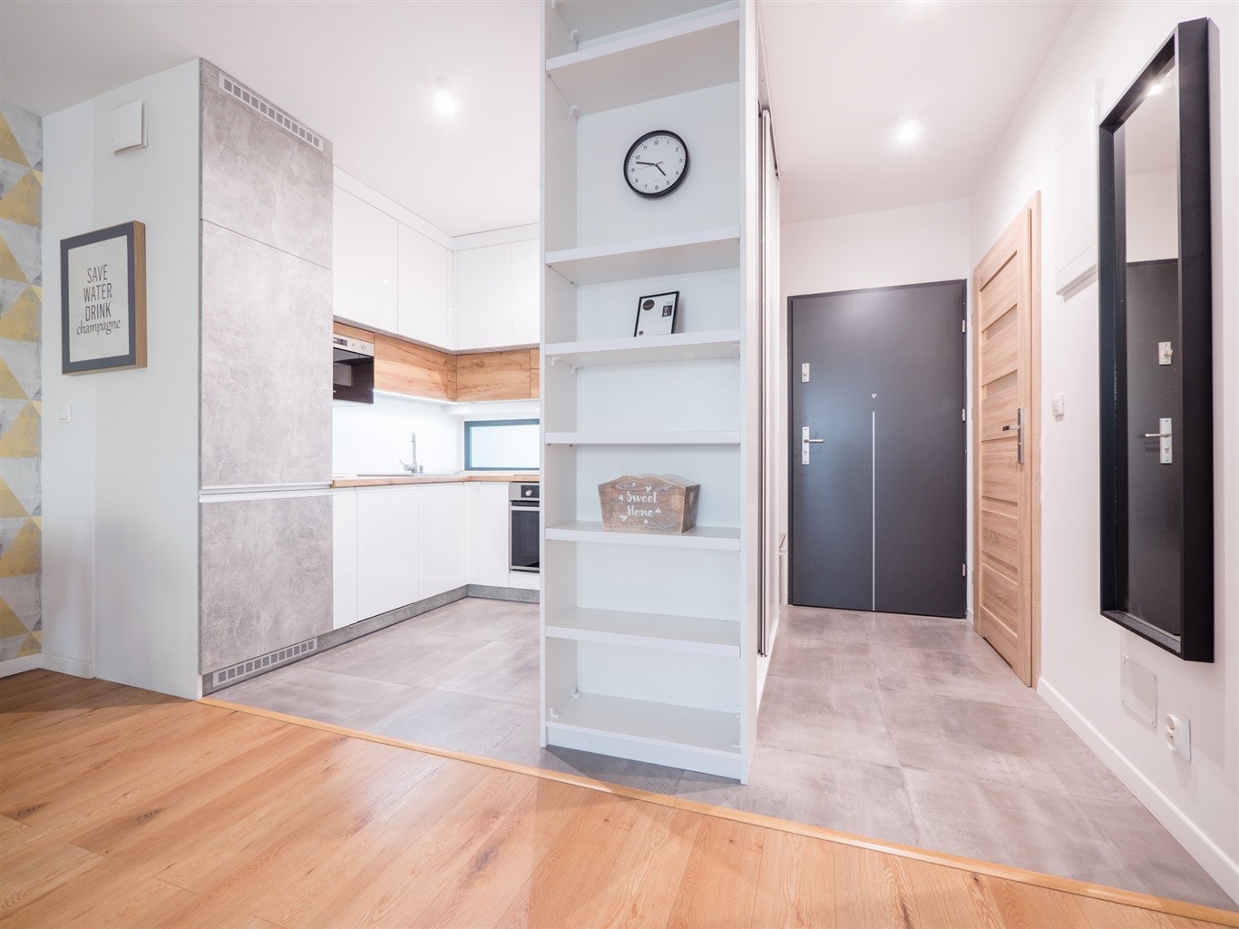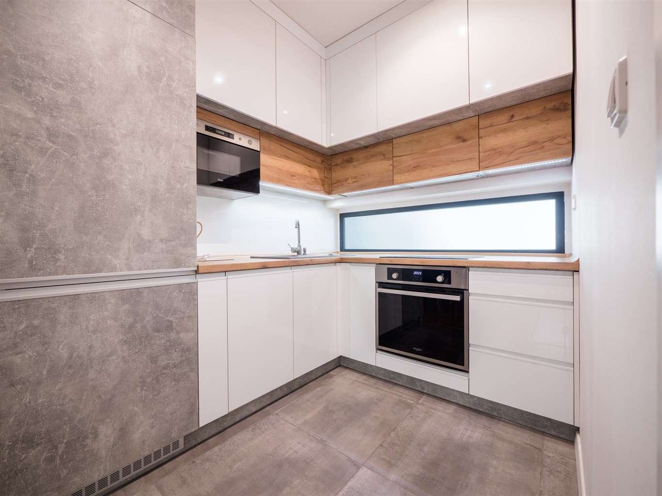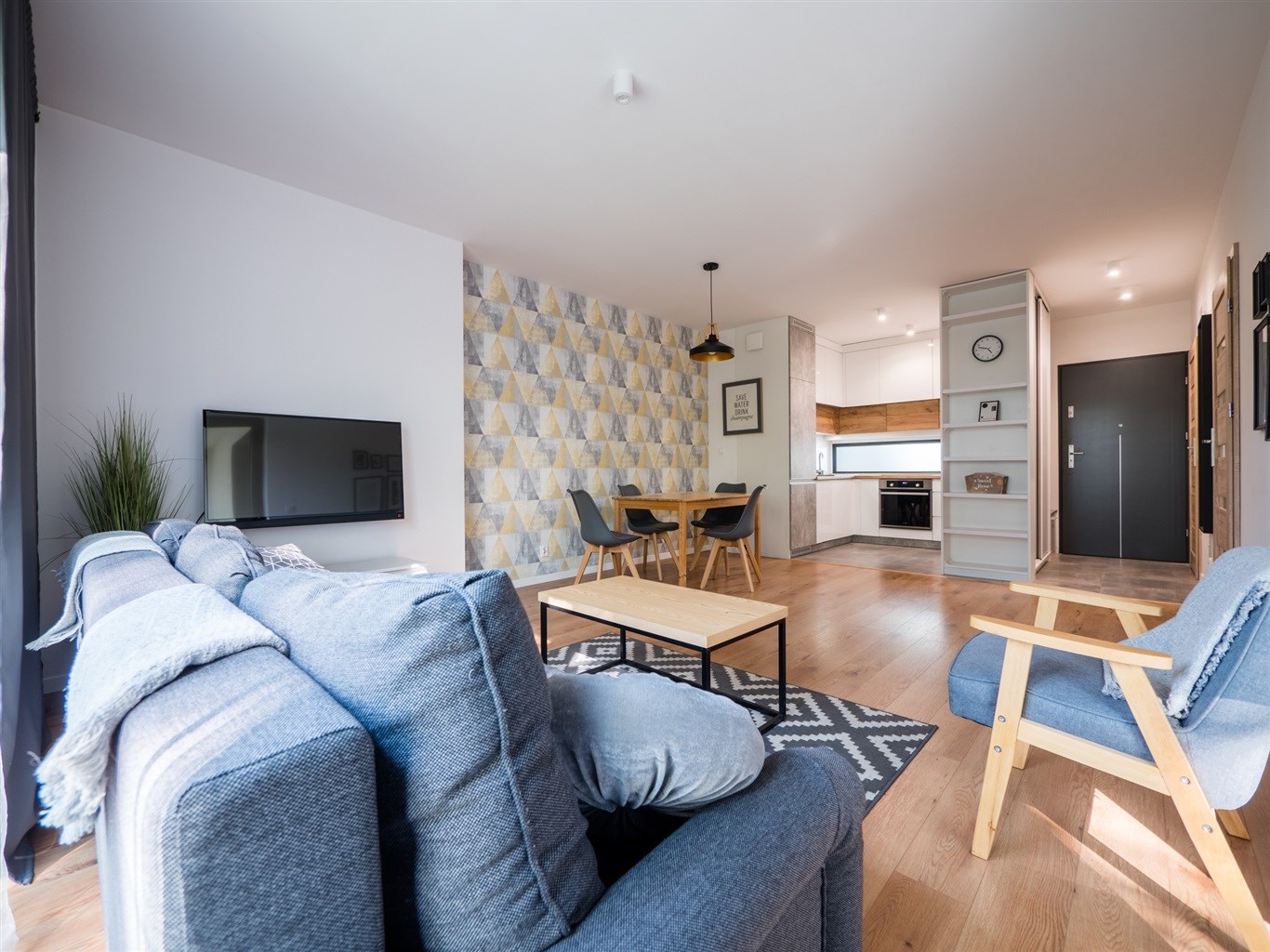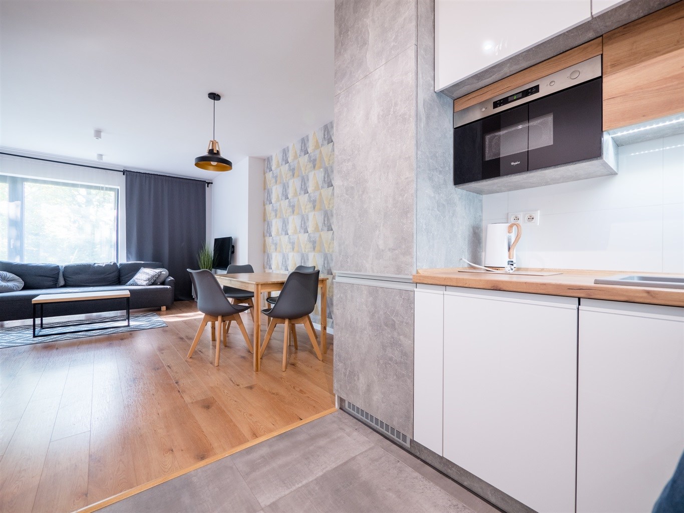 Kuchnia wyposażona w niezbędne sprzęty AGD (lodówko-zamrażarka, zmywarka, płyta indukcyjna, piekarnik, okap, mikrofalówka) Łazienka wykończona w glazurze, wyposażona w kabinę prysznicową oraz pralkę. W salonie, sofa, telewizor, stół + 4 krzesła. Sypialnia wyposażona w łóżko z materacem oraz szafę w zabudowie. W przedpokoju pojemna szafa oraz wieszaki i siedzisko.
