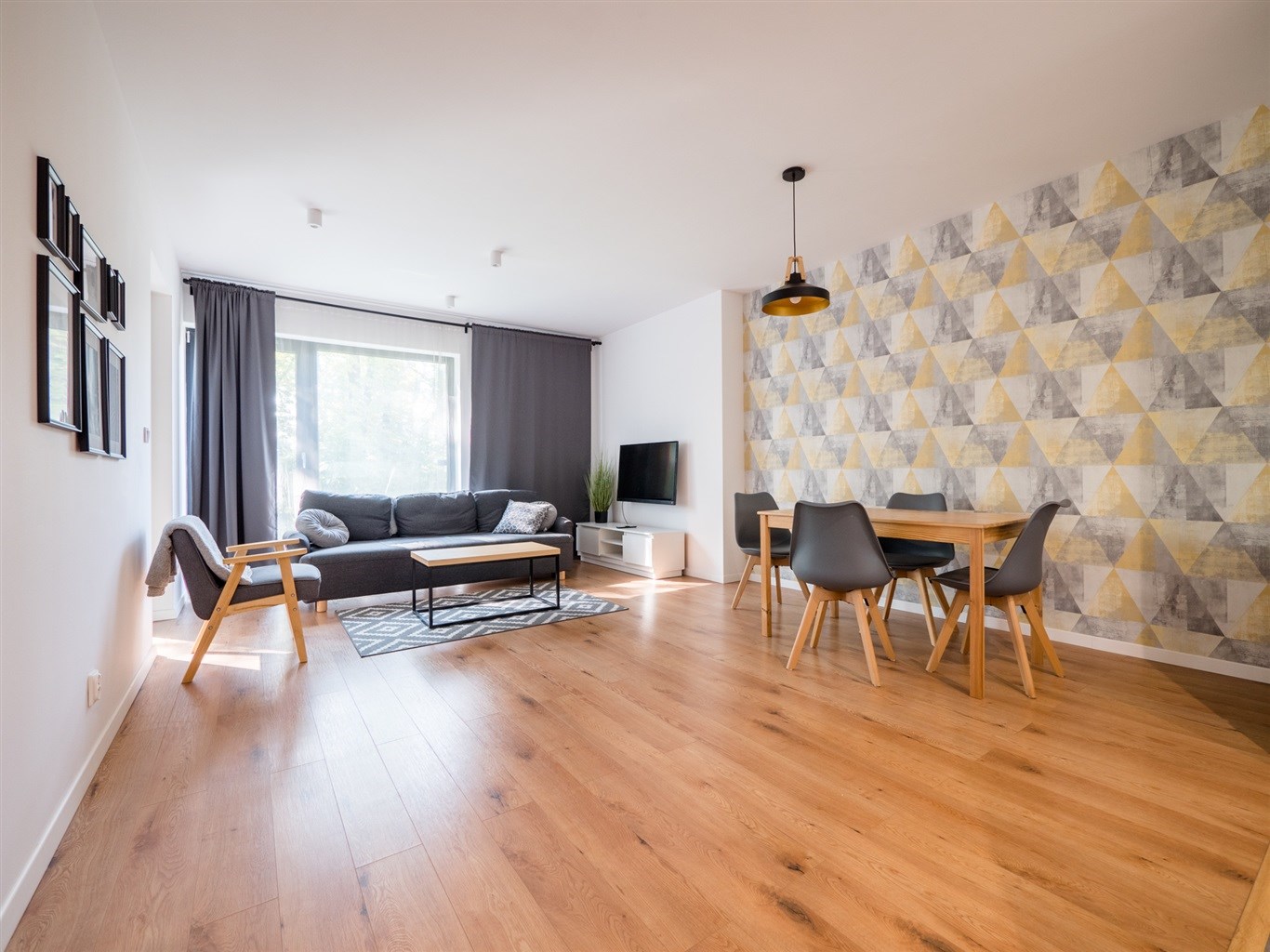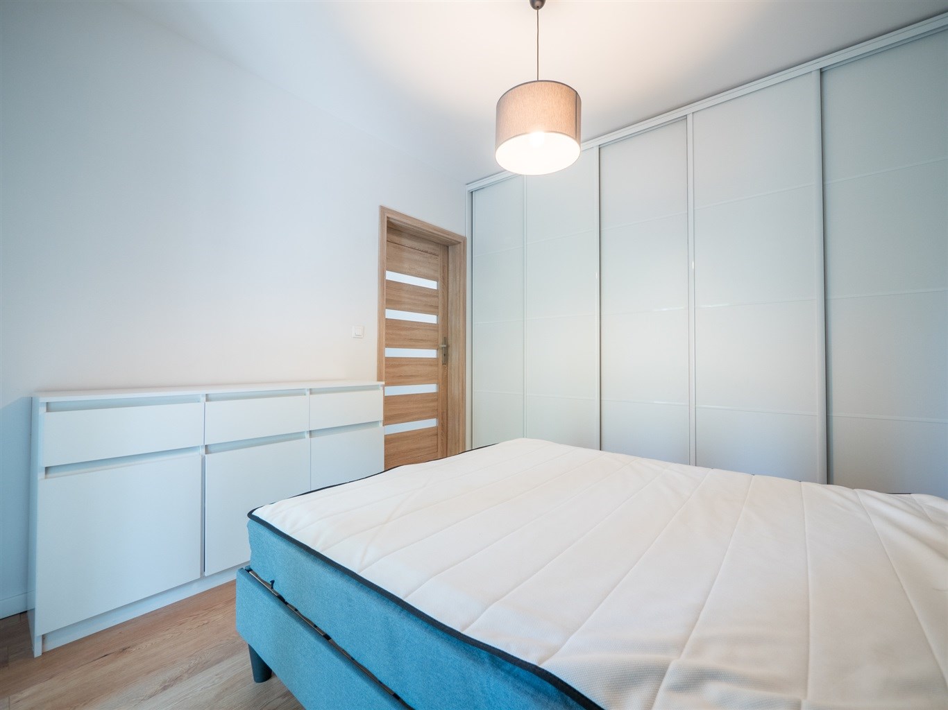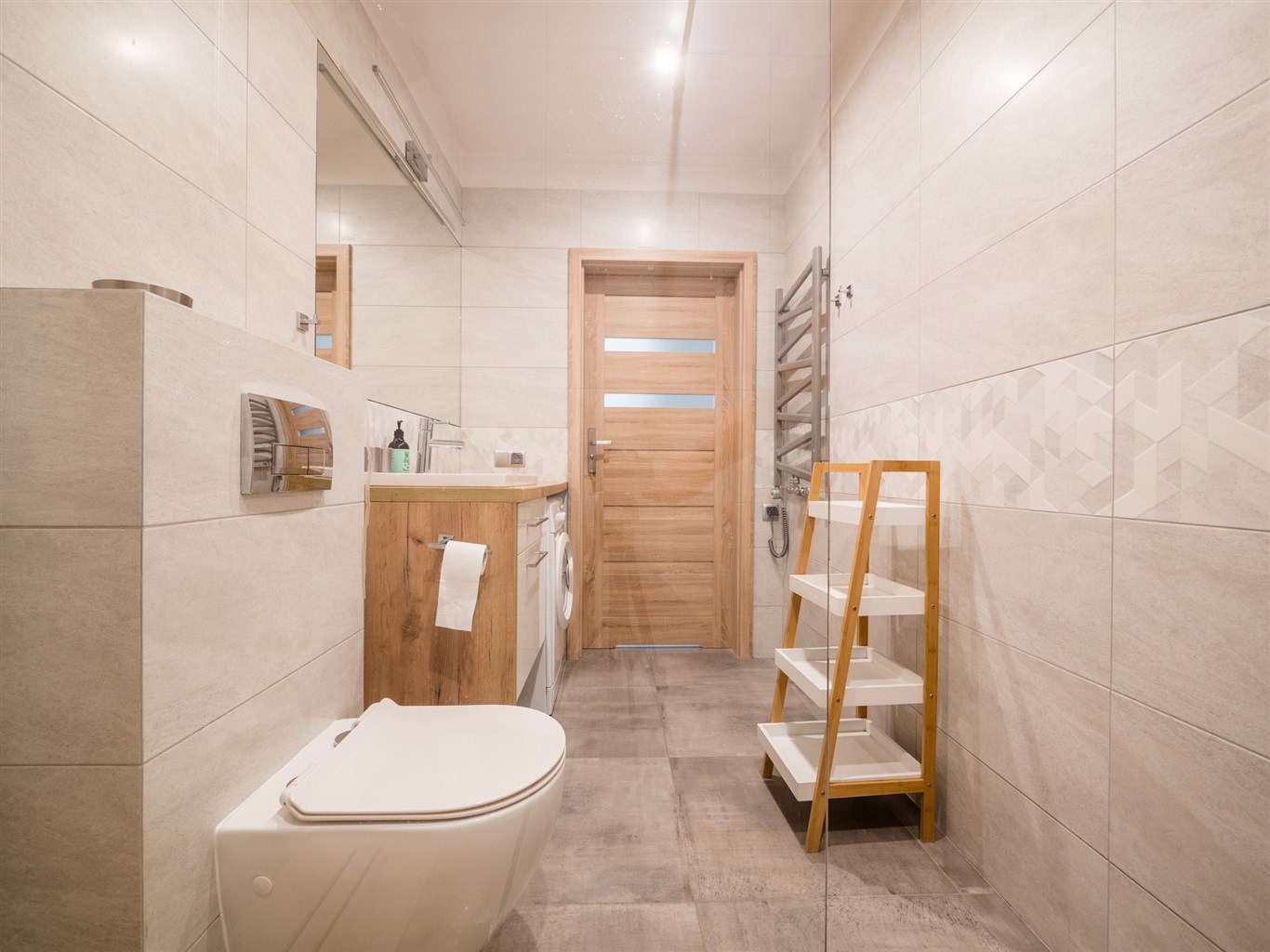 Kuchnia wyposażona w niezbędne sprzęty AGD (lodówko-zamrażarka, zmywarka, płyta indukcyjna, piekarnik, okap, mikrofalówka) Łazienka wykończona w glazurze, wyposażona w kabinę prysznicową oraz pralkę. W salonie, sofa, telewizor, stół + 4 krzesła. Sypialnia wyposażona w łóżko z materacem oraz szafę w zabudowie. W przedpokoju pojemna szafa oraz wieszaki i siedzisko.