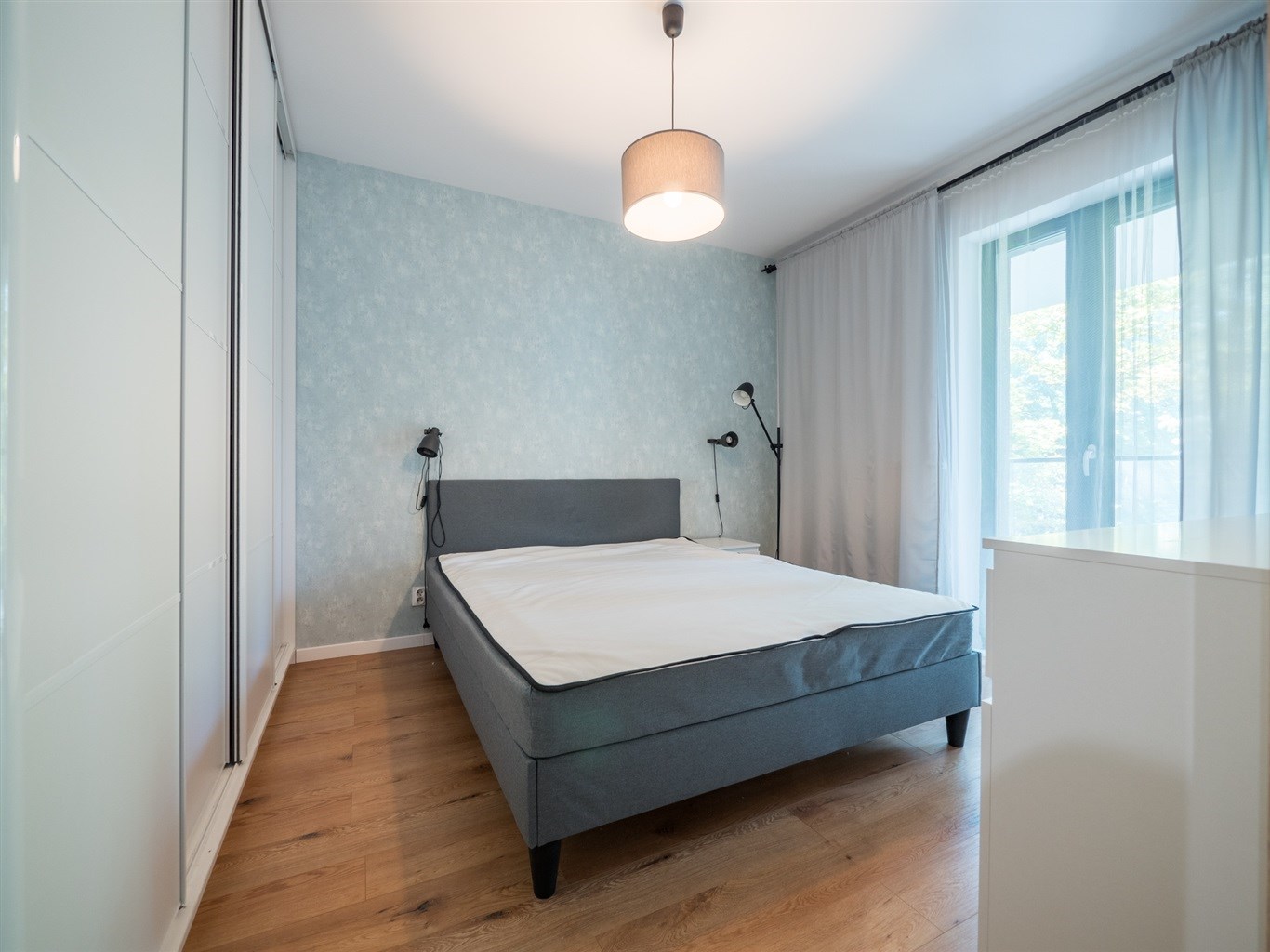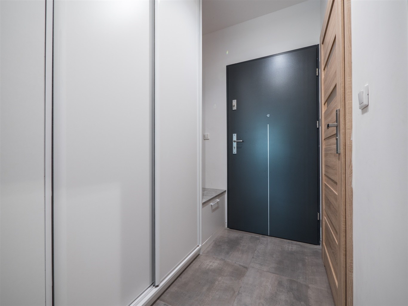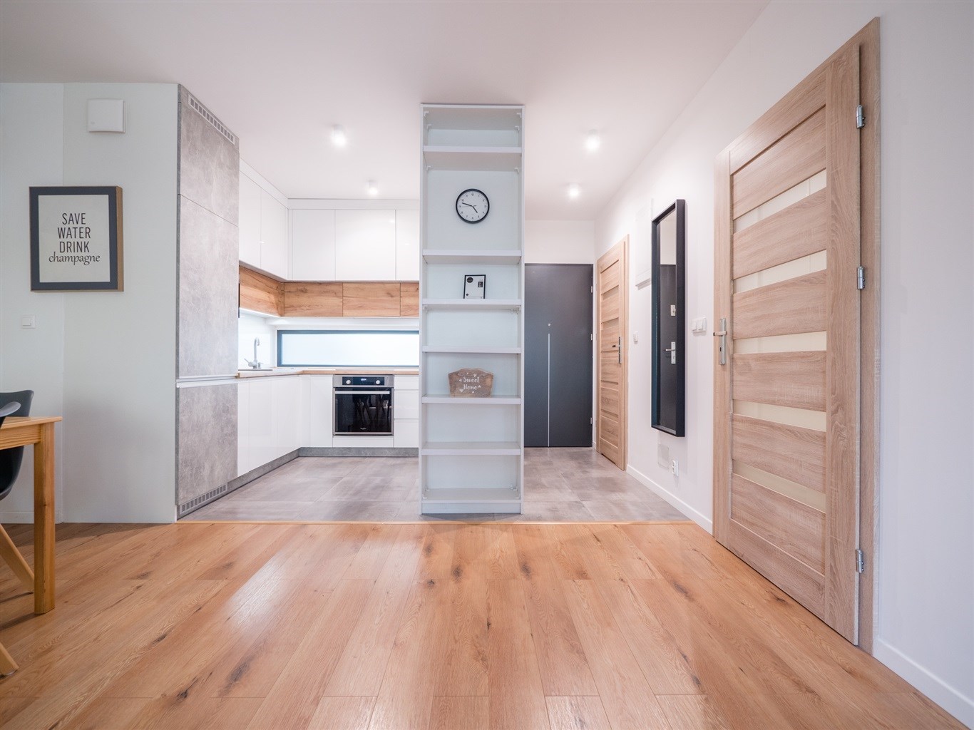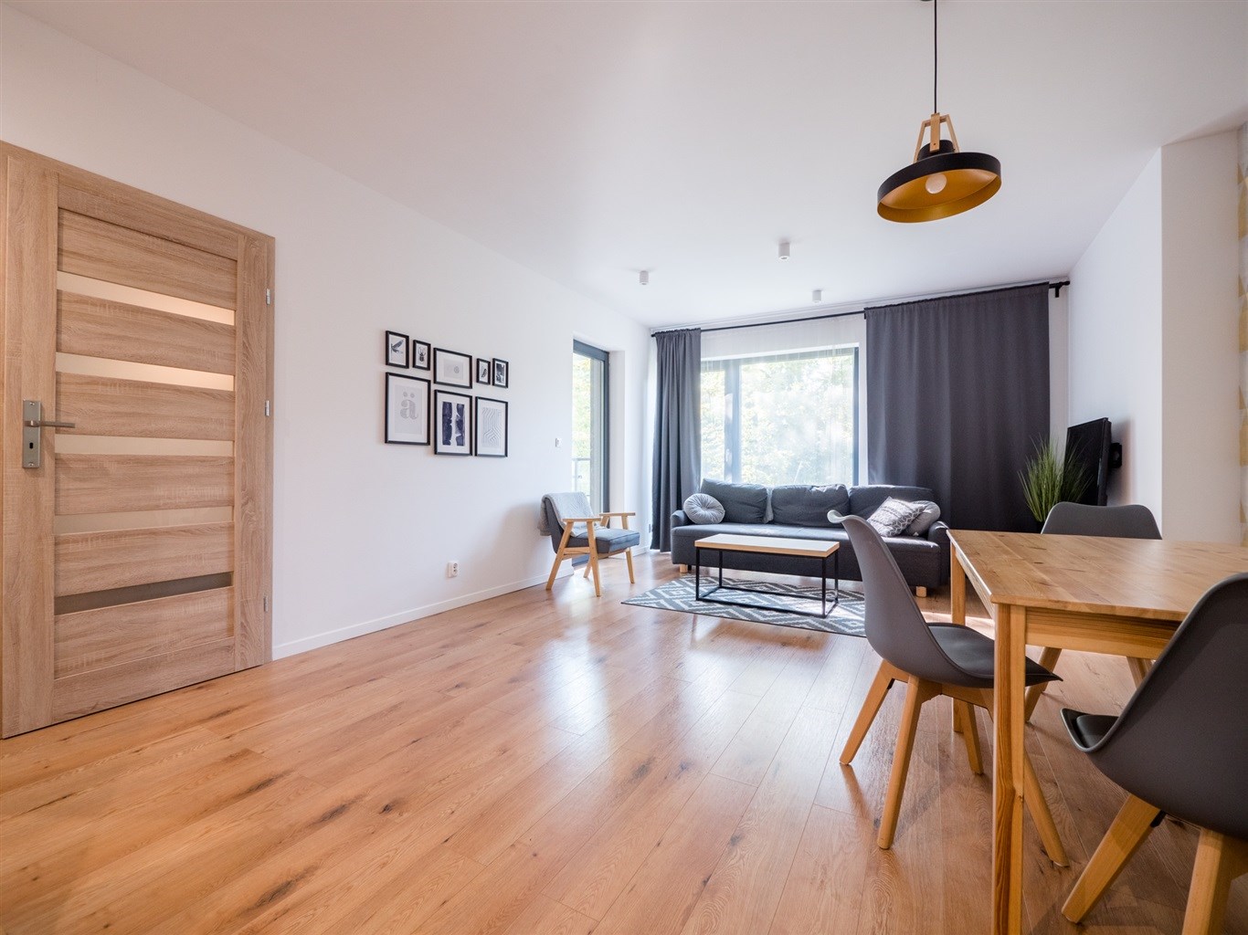 Kuchnia wyposażona w niezbędne sprzęty AGD (lodówko-zamrażarka, zmywarka, płyta indukcyjna, piekarnik, okap, mikrofalówka) Łazienka wykończona w glazurze, wyposażona w kabinę prysznicową oraz pralkę. W salonie, sofa, telewizor, stół + 4 krzesła. Sypialnia wyposażona w łóżko z materacem oraz szafę w zabudowie. W przedpokoju pojemna szafa oraz wieszaki i siedzisko.