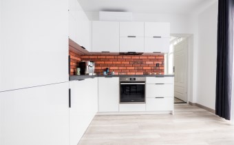 Kuchnie w zabudowie wraz ze wszystkimi niezbędnymi sprzętami AGD; lodówka, zmywarka, płyta, zlew, piekarnik oraz stół z dwoma krzesłami.