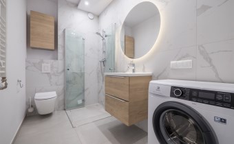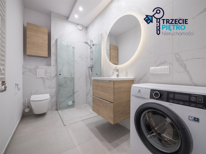 W łazience glazura, kabina prysznicowa wraz z deszczownicą, pralka, WC, pełna zabudowa meblowa.