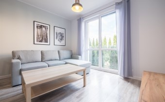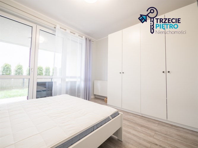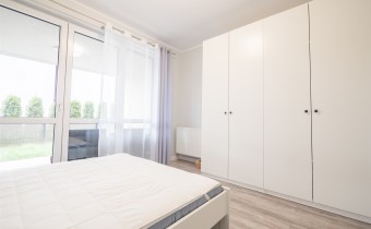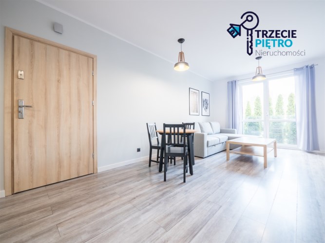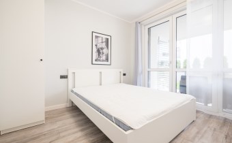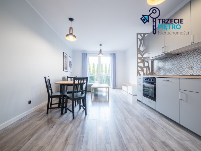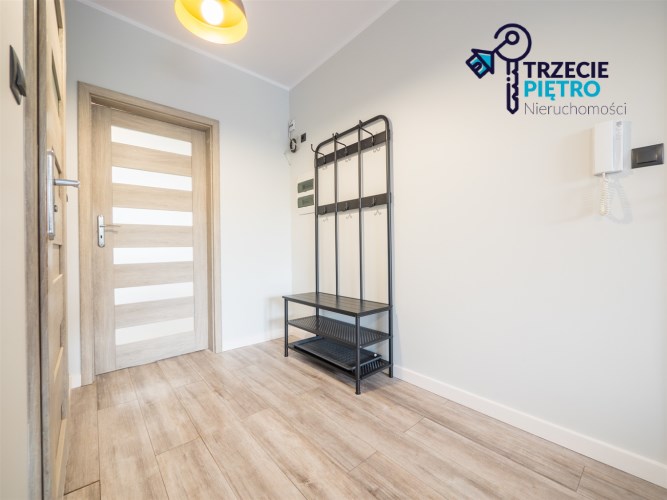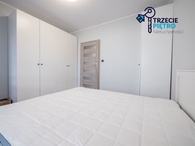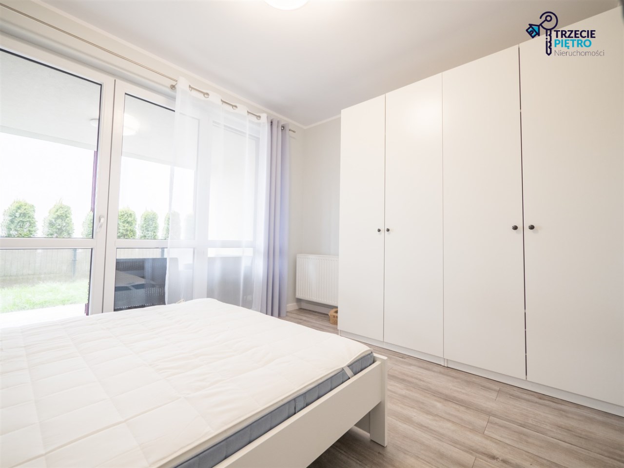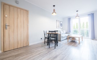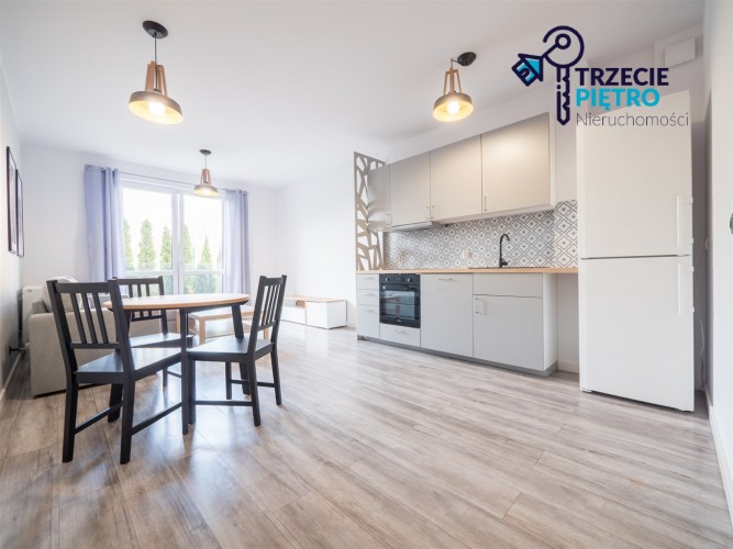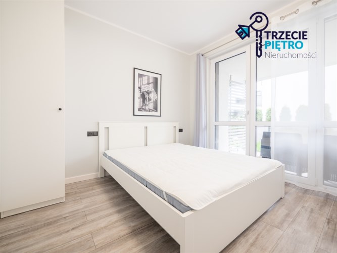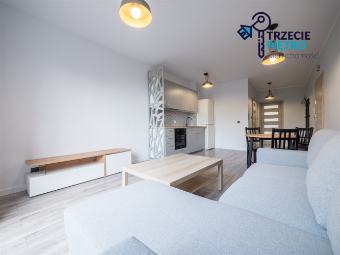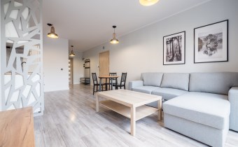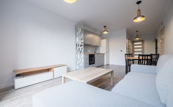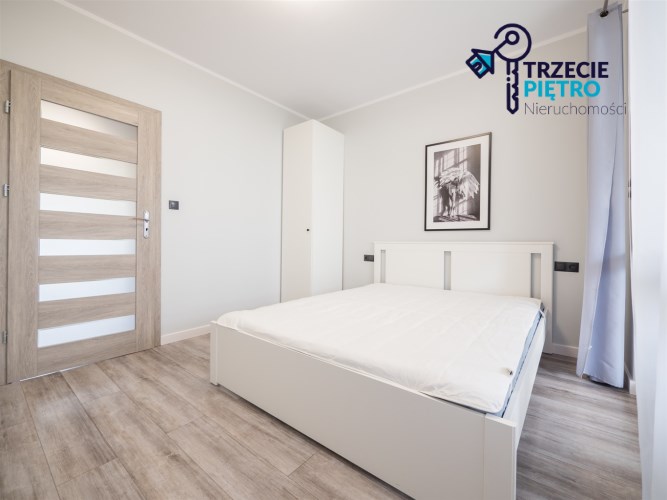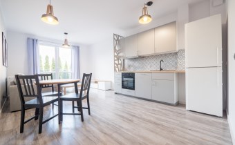 Salon wyposażony w nowoczesną sofę, stół + trzy krzesła, półkę RTV oraz stolik okolicznościowy. Sypialnia wyposażona w łóżko małżeńskie z materacem oraz pojemną szafę. Aneks kuchenny w nowej zabudowie wyposażony we wszystkie niezbędne sprzęty AGD (nowa lodówka, nowa zmywarka, piekarnik, zlew, płyta indukcyjna, nowy okap).