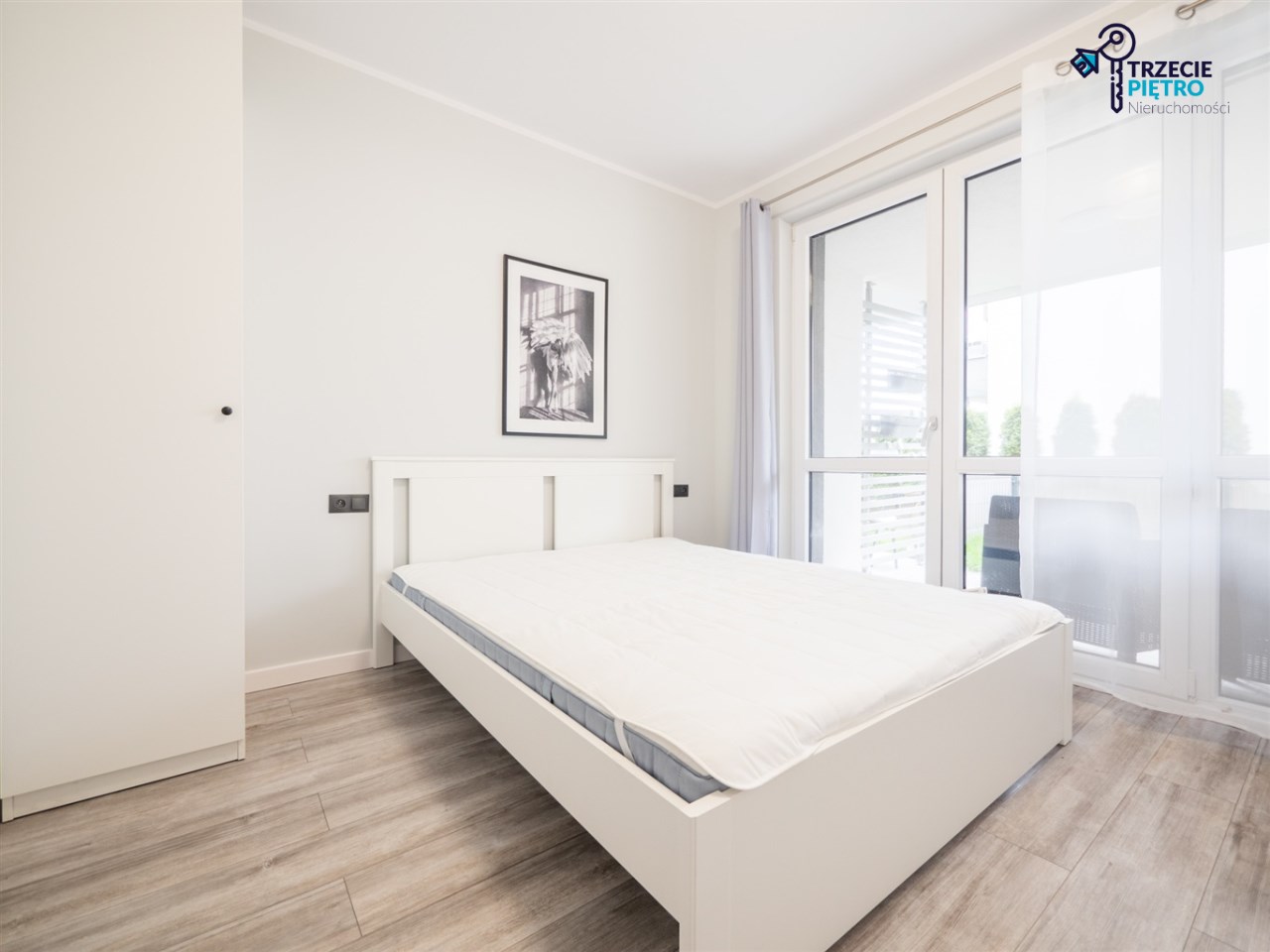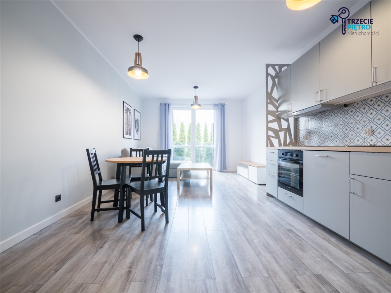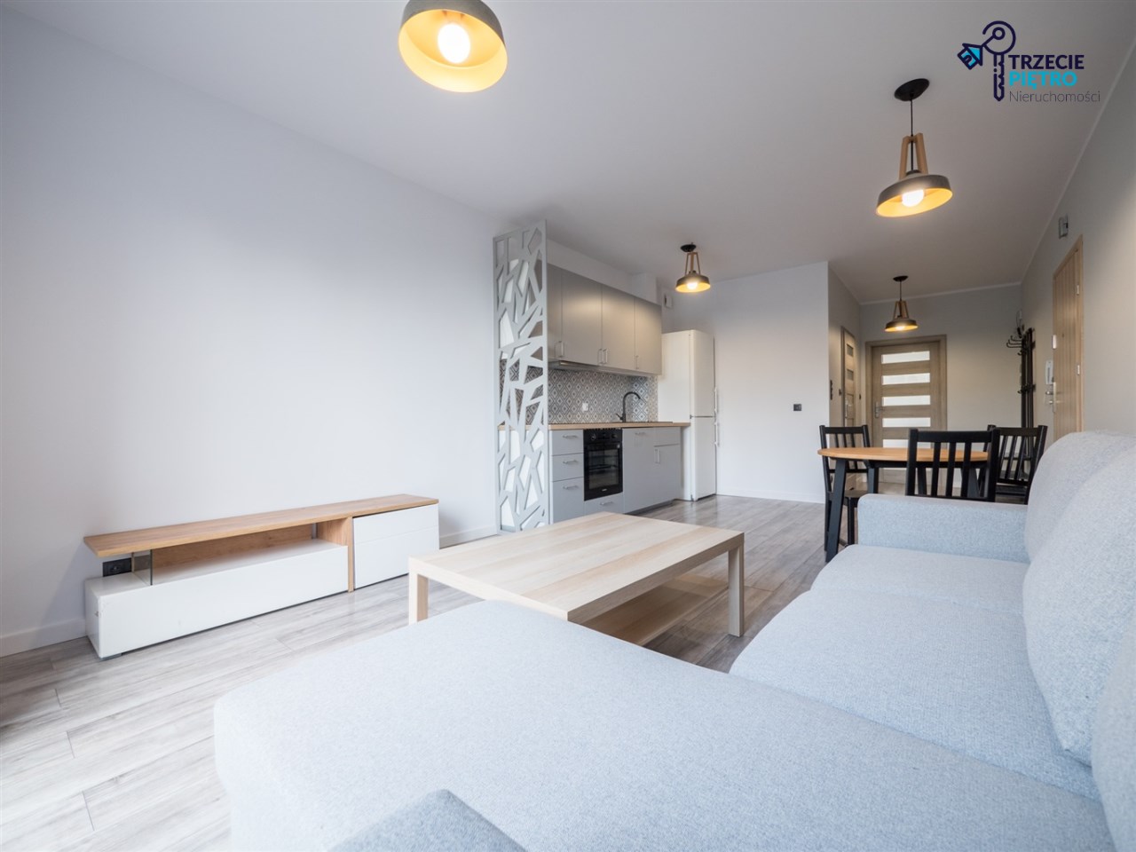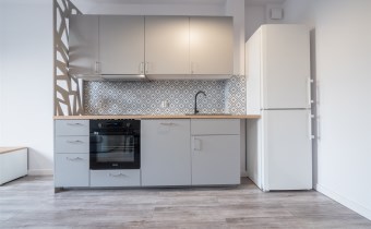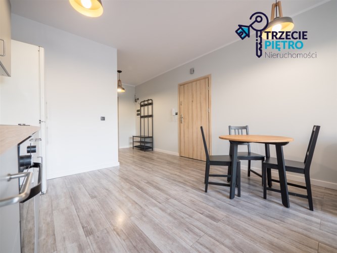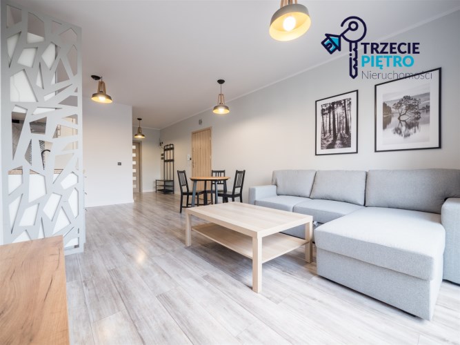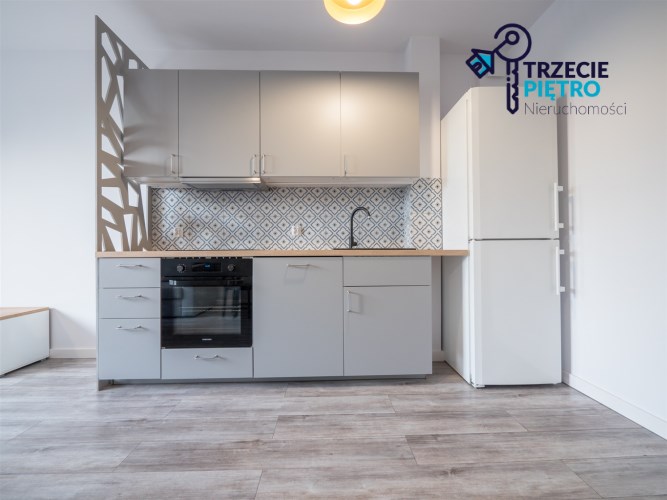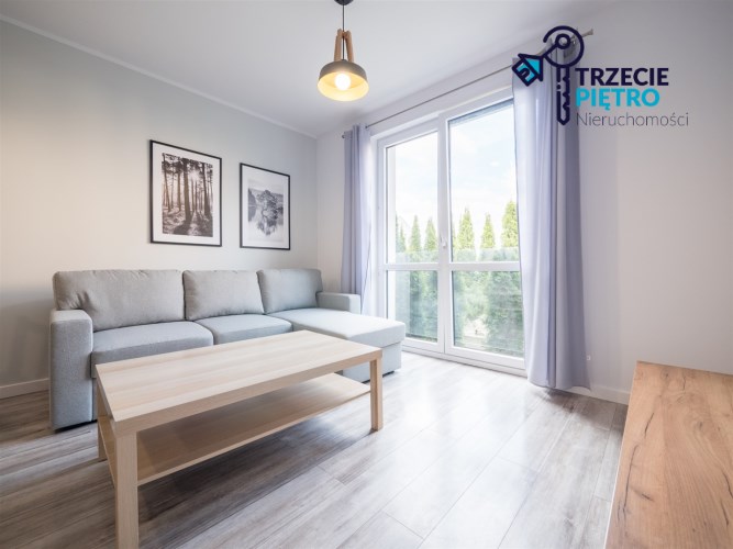 Salon wyposażony w nowoczesną sofę, stół + trzy krzesła, półkę RTV oraz stolik okolicznościowy. Sypialnia wyposażona w łóżko małżeńskie z materacem oraz pojemną szafę. Aneks kuchenny w nowej zabudowie wyposażony we wszystkie niezbędne sprzęty AGD (nowa lodówka, nowa zmywarka, piekarnik, zlew, płyta indukcyjna, nowy okap).