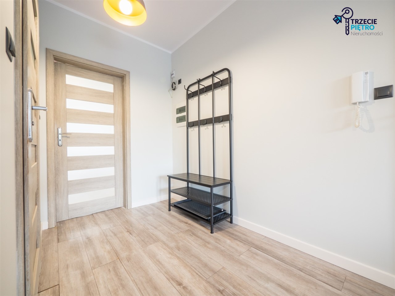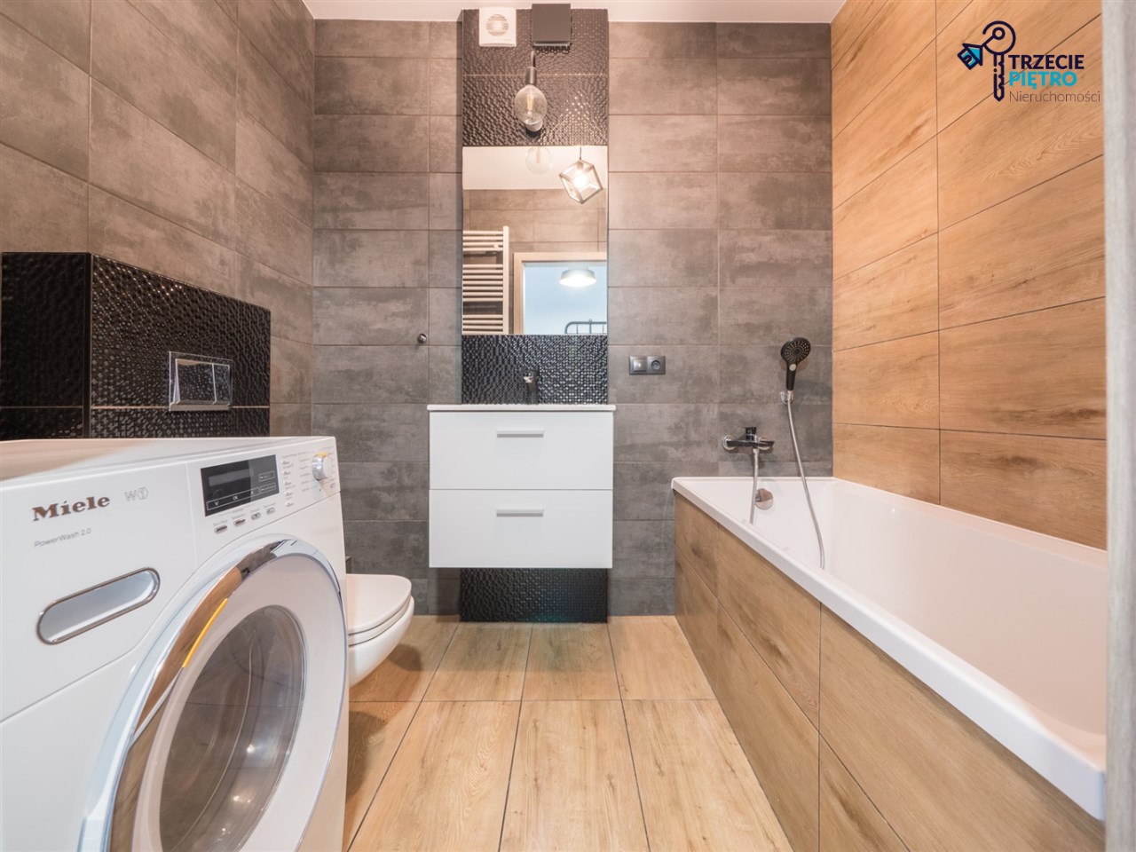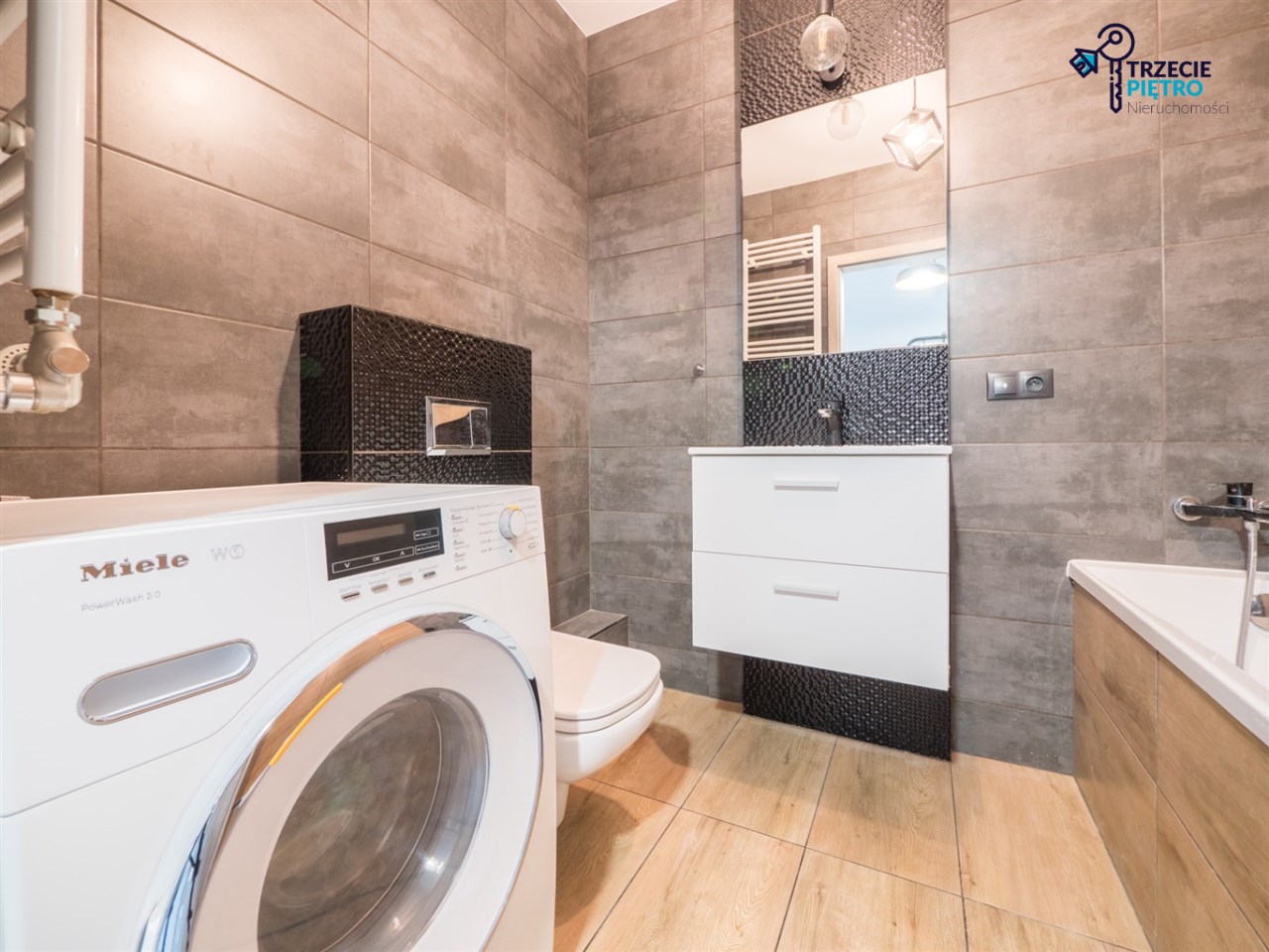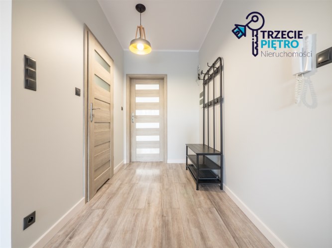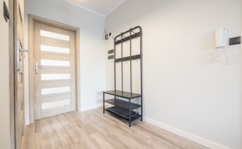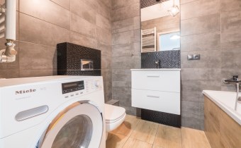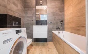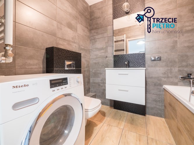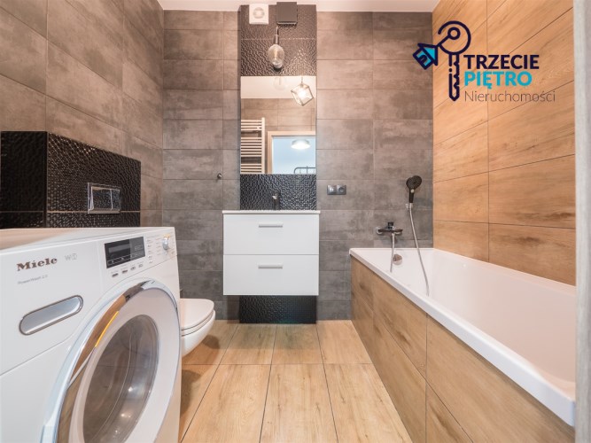 W łazience wysokiej klasy glazura, wanna, nowa pralka. Dodatkowo w przedpokoju wieszaki na odzież wierzchnią wraz z siedziskiem.