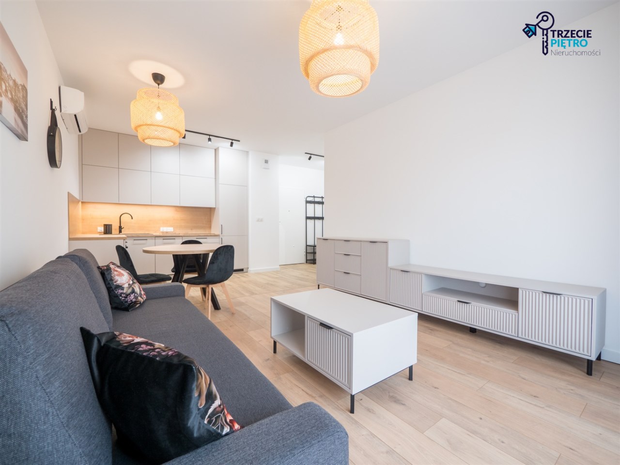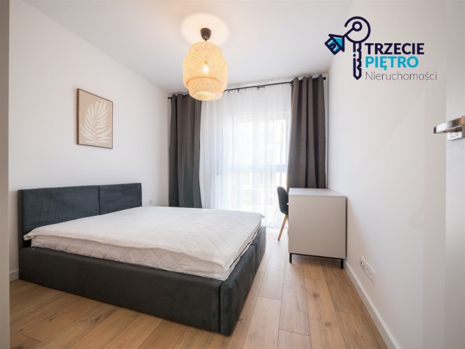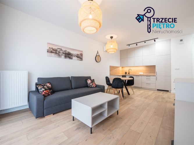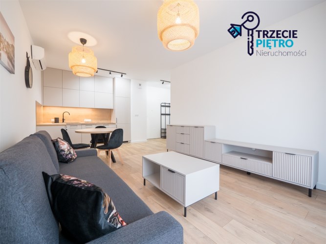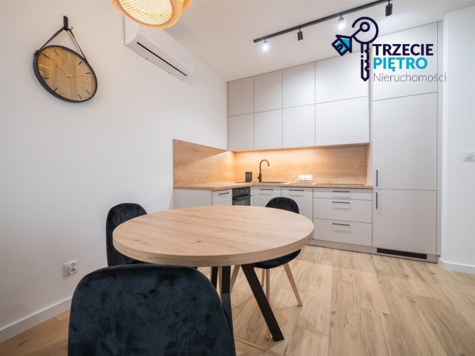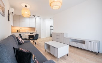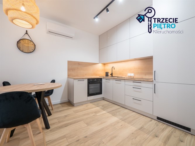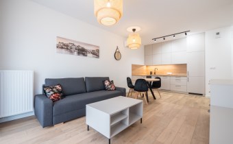 Salon wyposażony w nowoczesną sofę, stół + trzy krzesła, półkę RTV oraz klimatyzację. Sypialnia wyposażona w łóżko małżeńskie z materacem, szafę w zabudowie oraz biurko. Aneks kuchenny w zabudowie wyposażony we wszystkie niezbędne sprzęty AGD (lodówka, zmywarka, piekarnik, zlew, płyta).