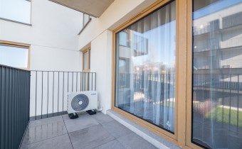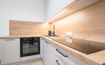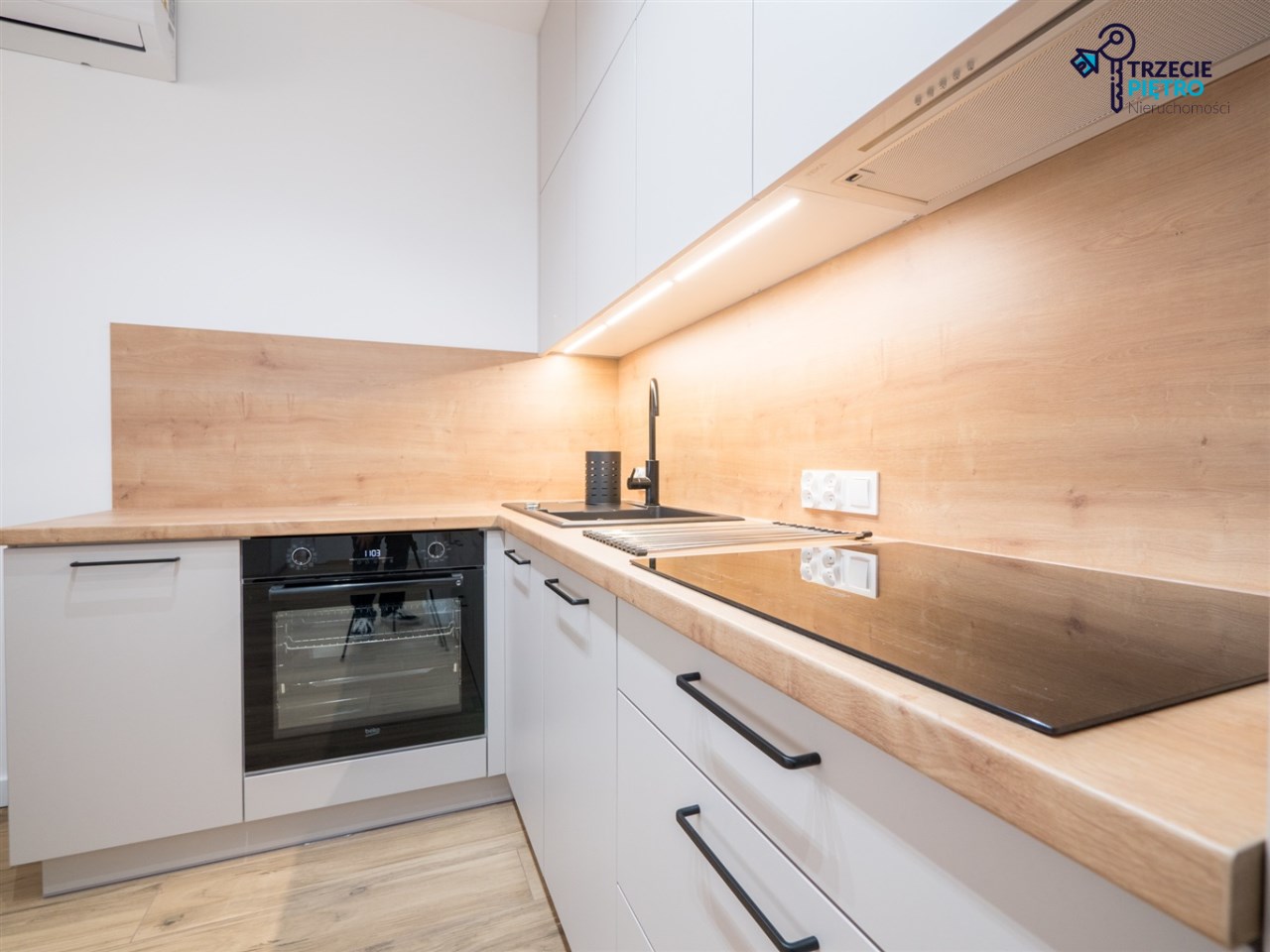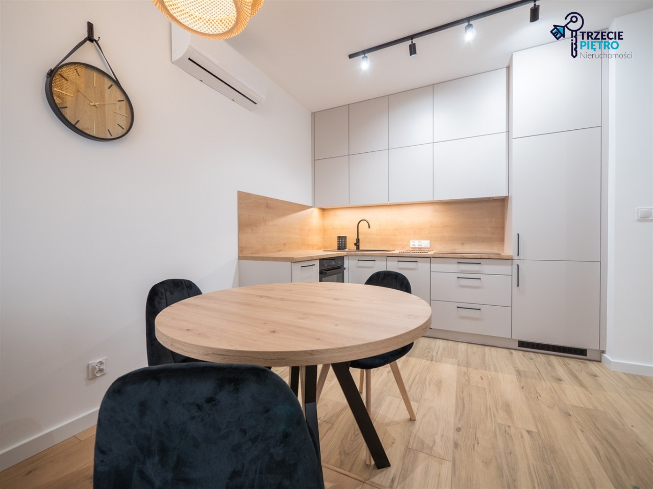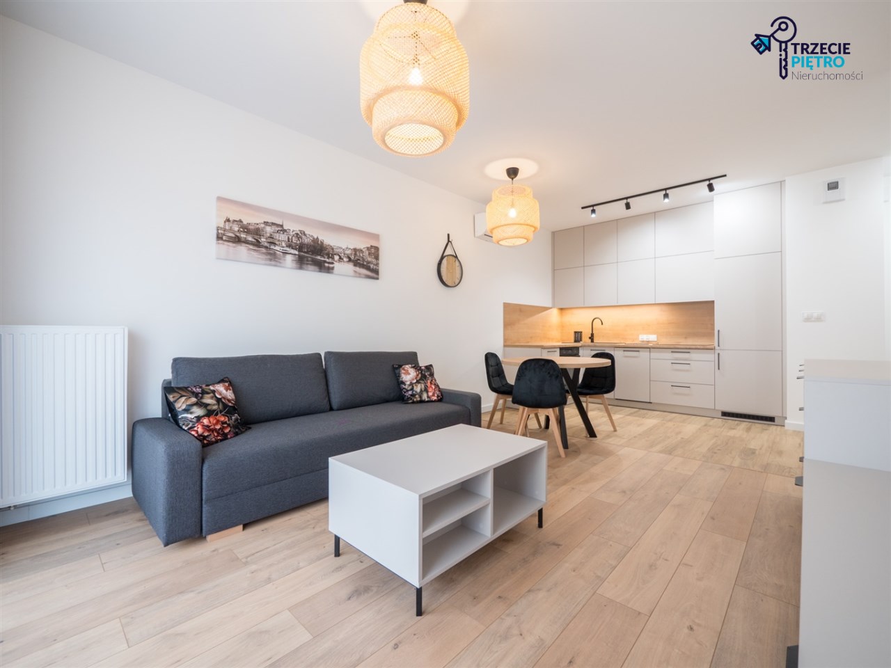Salon wyposażony w nowoczesną sofę, stół + trzy krzesła, półkę RTV oraz klimatyzację. Sypialnia wyposażona w łóżko małżeńskie z materacem, szafę w zabudowie oraz biurko. Aneks kuchenny w zabudowie wyposażony we wszystkie niezbędne sprzęty AGD (lodówka, zmywarka, piekarnik, zlew, płyta).