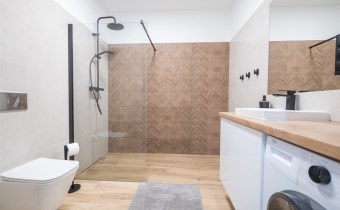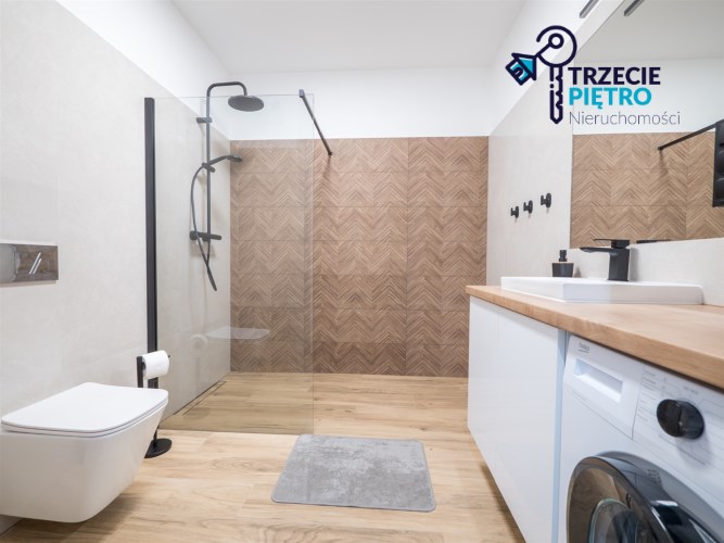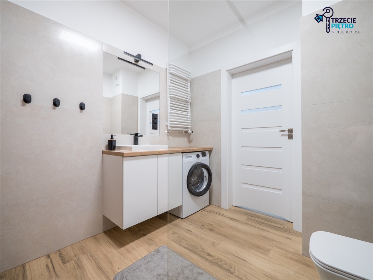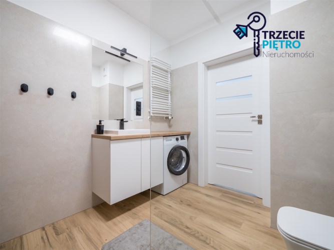 W łazience wysokiej klasy glazura, kabina prysznicowa, pralka. Dodatkowo przedpokój wyposażony w szafę w zabudowie. W pokojach na podłogach panele o wysokiej klasie ścieralności.