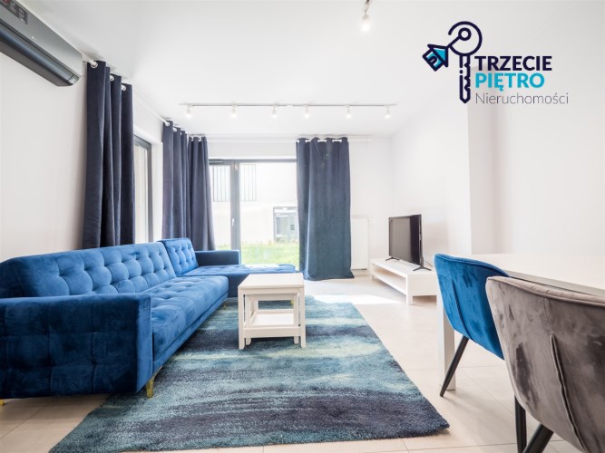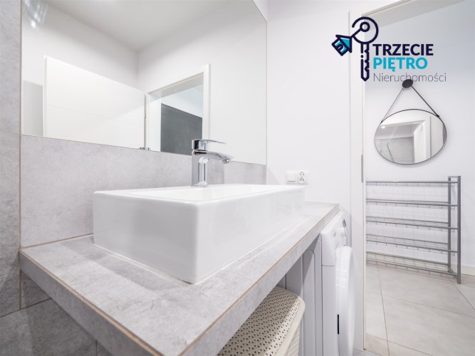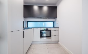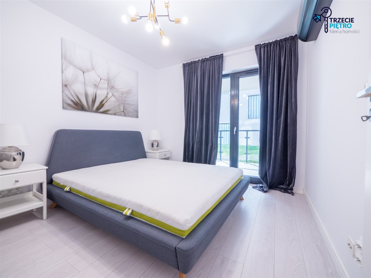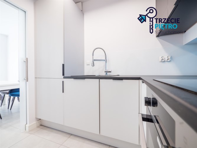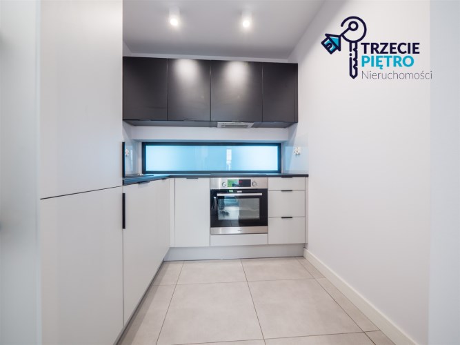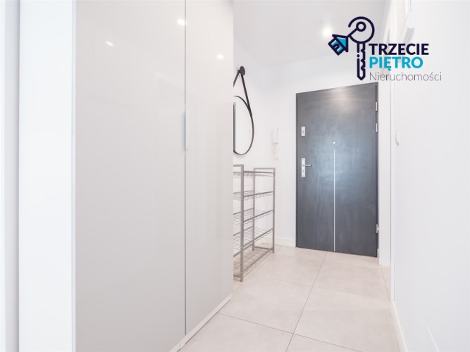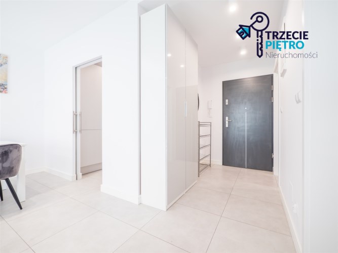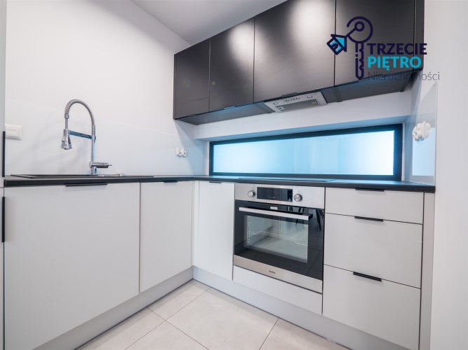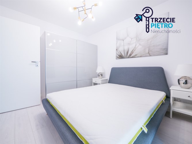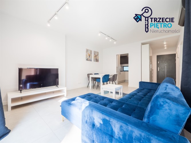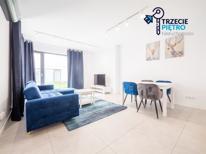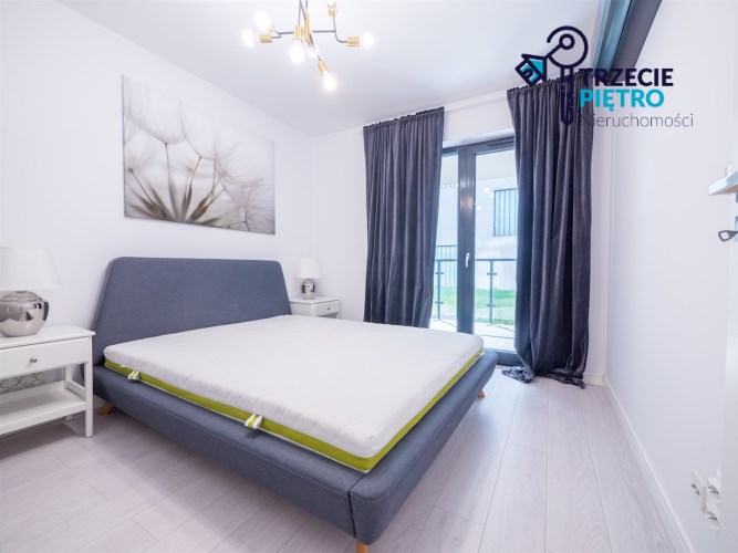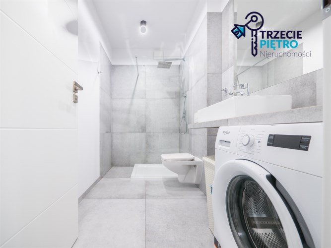 Kuchnia wyposażona w niezbędne sprzęty AGD (lodówka, zmywarka, płyta indukcyjna, piekarnik, okap) Łazienka wykończona w glazurze, wyposażona w kabinę prysznicową oraz pralkę. W salonie, sofa, telewizor, stół + 4 krzesła. Sypialnia wyposażona w łóżko z materacem oraz szafę. W przedpokoju pojemna szafa.