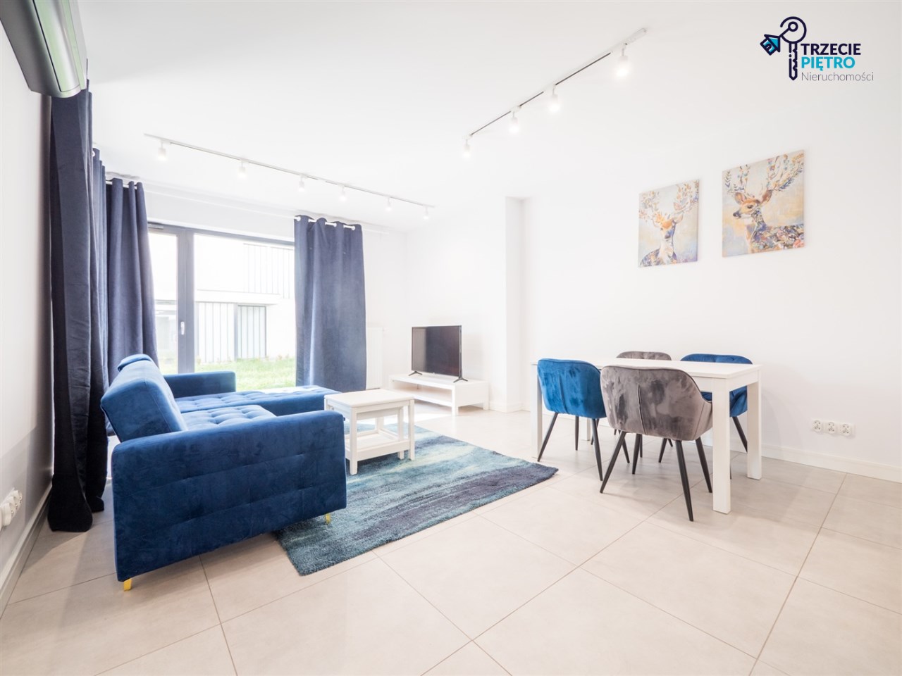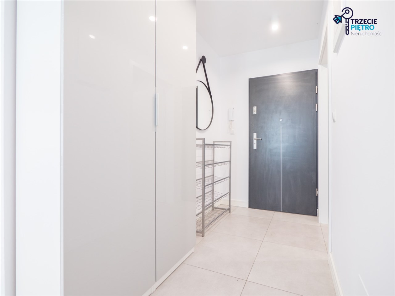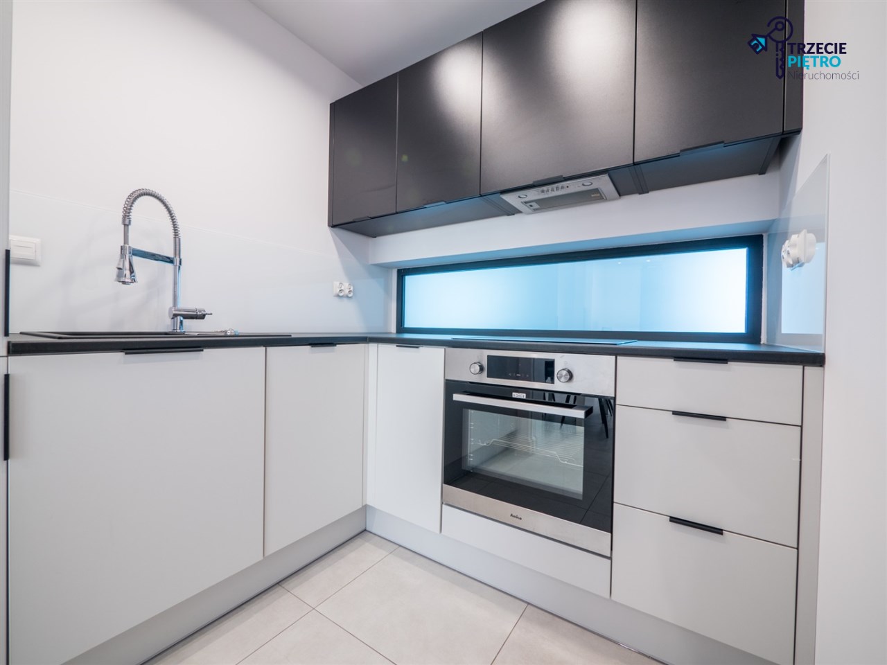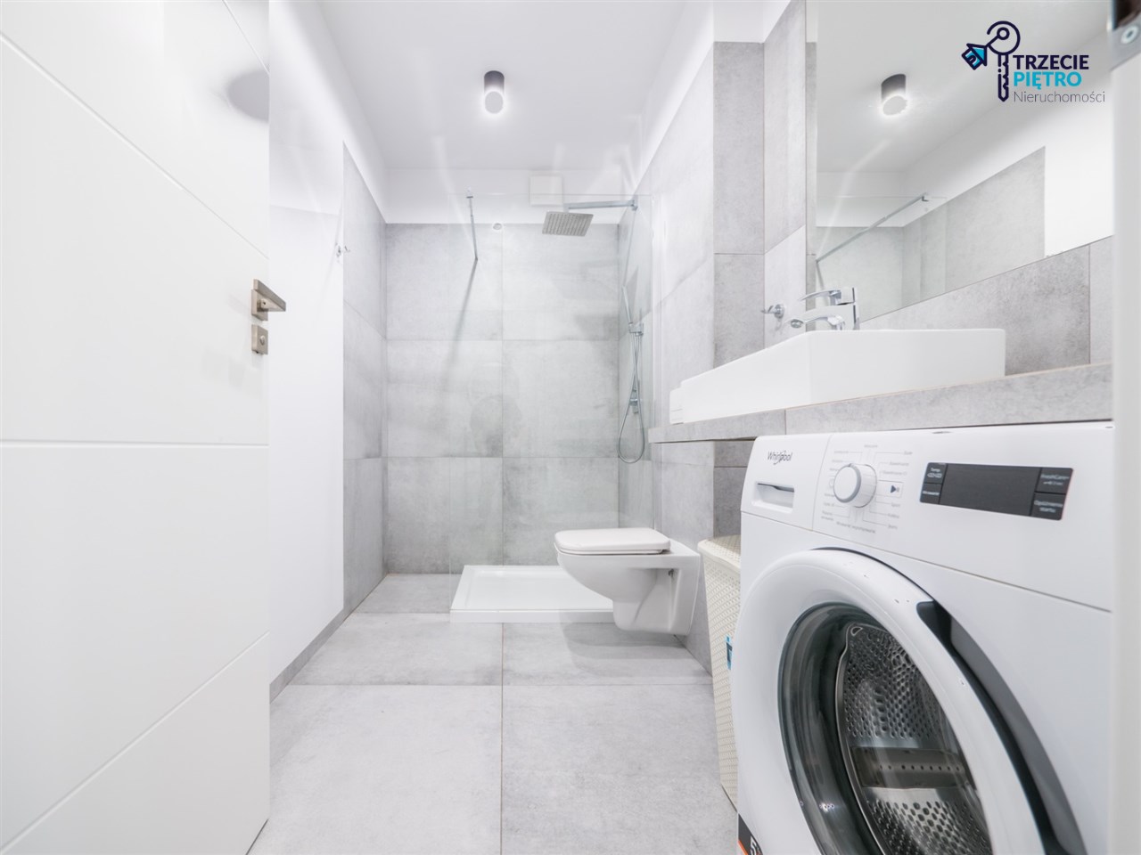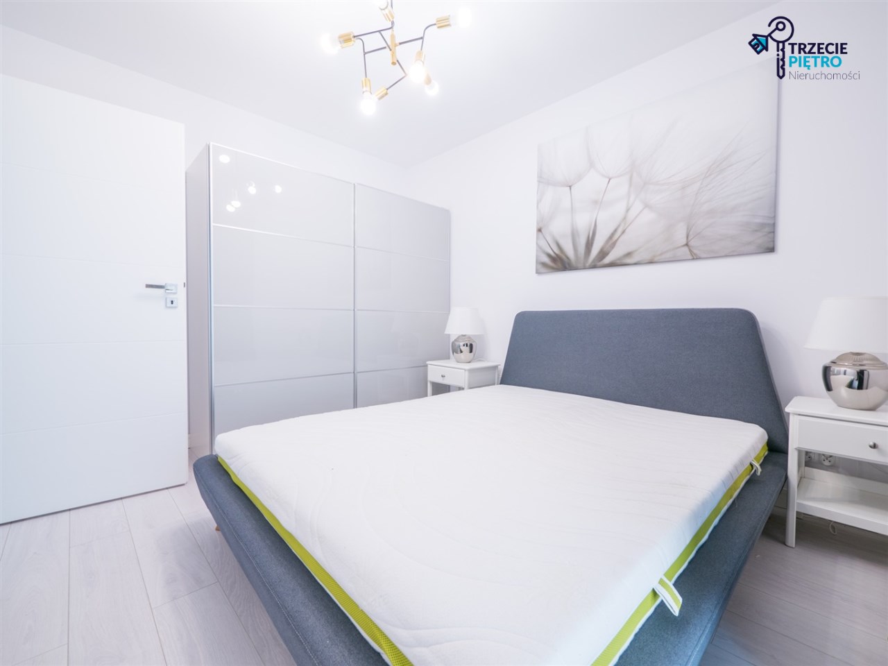 Kuchnia wyposażona w niezbędne sprzęty AGD (lodówka, zmywarka, płyta indukcyjna, piekarnik, okap) Łazienka wykończona w glazurze, wyposażona w kabinę prysznicową oraz pralkę. W salonie, sofa, telewizor, stół + 4 krzesła. Sypialnia wyposażona w łóżko z materacem oraz szafę. W przedpokoju pojemna szafa.
