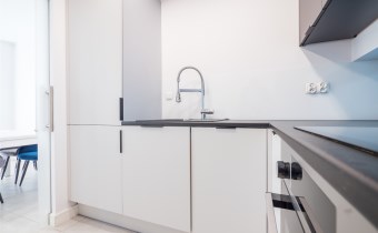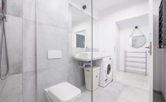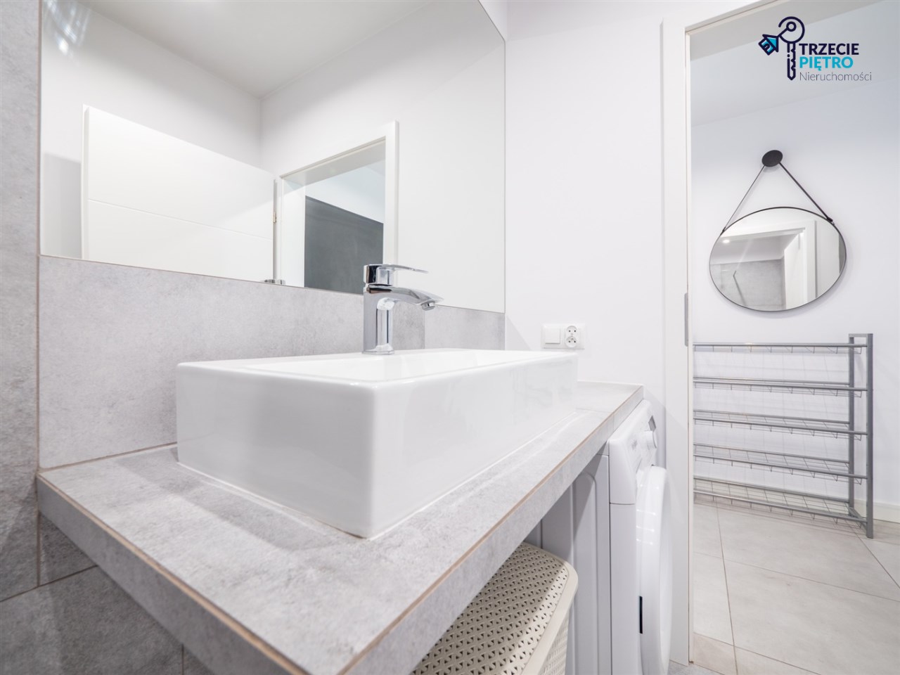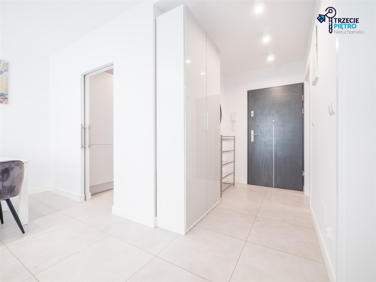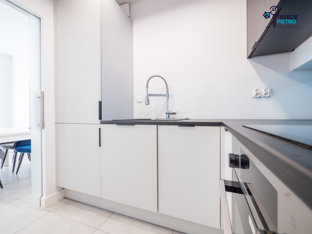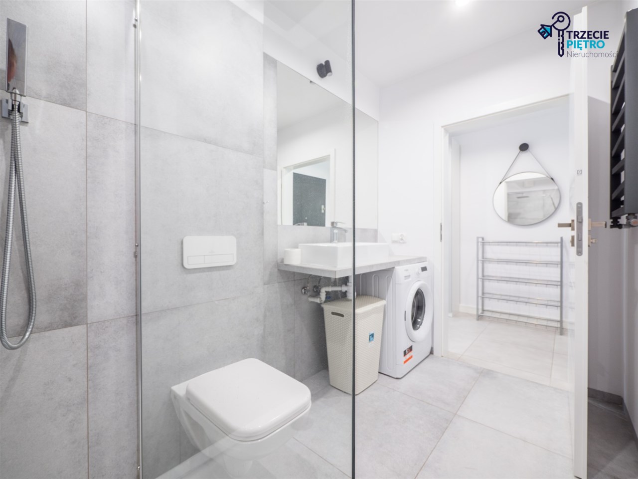 Kuchnia wyposażona w niezbędne sprzęty AGD (lodówka, zmywarka, płyta indukcyjna, piekarnik, okap) Łazienka wykończona w glazurze, wyposażona w kabinę prysznicową oraz pralkę. W salonie, sofa, telewizor, stół + 4 krzesła. Sypialnia wyposażona w łóżko z materacem oraz szafę. W przedpokoju pojemna szafa.