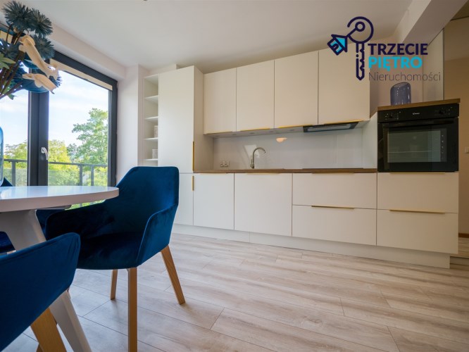 Salon wyposażony w nowoczesną sofę, stół + trzy krzesła, półkę RTV oraz telewizor. Sypialnia wyposażona w łóżko małżeńskie z materacem. Drugi pokój do własnej aranżacji na sypialnię/biuro/gabinet. Aneks kuchenny w zabudowie wyposażony we wszystkie niezbędne sprzęty AGD (lodówka, zmywarka, piekarnik, zlew, płyta).