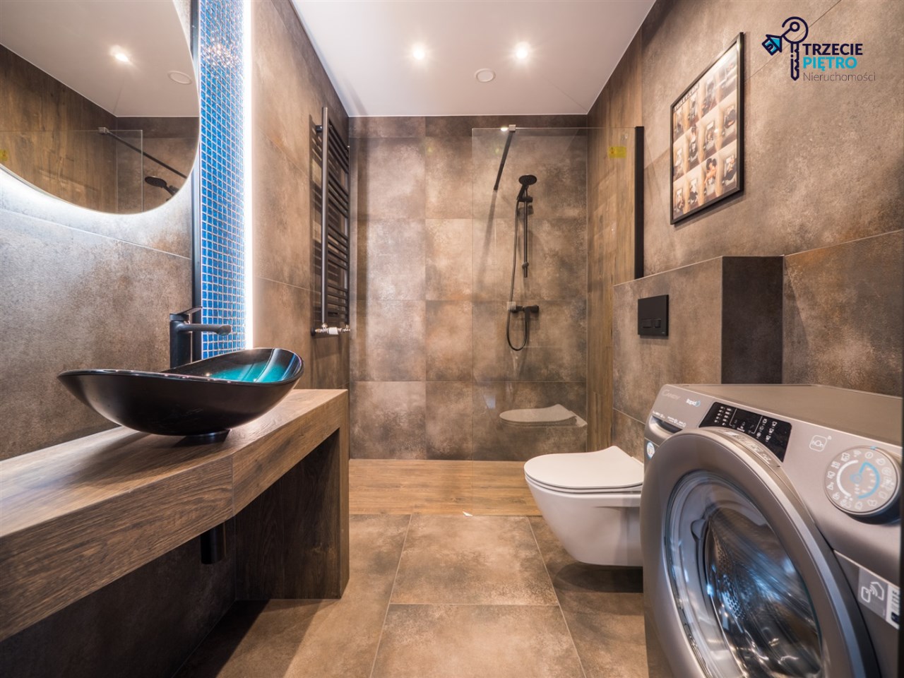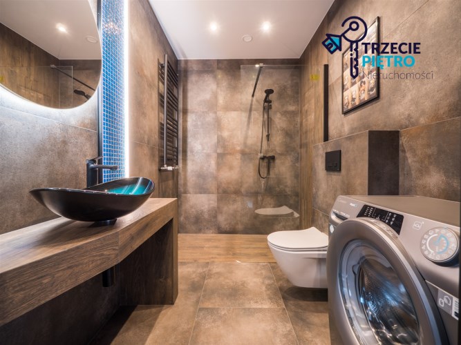 W łazience glazura najwyższej klasy, pralka, kabina prysznicowa. Na podłogach w pokojach panele o wysokiej klasie ścieralności. Mieszkanie ustawne, przestronne, wykończone z najwyższej klasy materiałów. Nowa kuchnia w zabudowie meblowej wyposażona we wszystkie niezbędne sprzęty AGD (lodówka, zmywarka, piekarnik, płyta indukcyjna, okap).